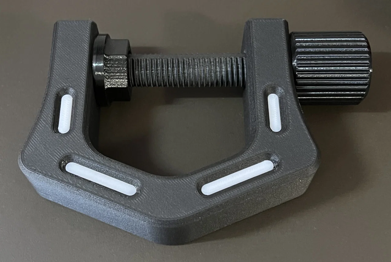 Mẫu Clamp (kẹp) in 3D, không cần supports, độ mở kẹp tới 55mm (2"). Có tuỳ chọn reinforcement inserts và dụng cụ đóng inserts để tăng độ cứng; khuyến nghị 6 walls và 20% infill, inserts 100% infill.