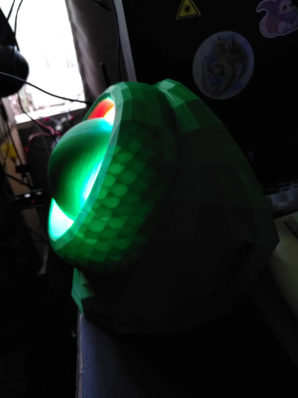 Điểm đặc biệt của thiết kế này nằm ở khả năng tích hợp hệ thống đèn LED vòng (RGB ring lights) ngay ở vị trí trung tâm, tạo ra hiệu ứng ánh sáng rực rỡ như những chiến binh trong tương lai. Bạn có thể dễ dàng cấp nguồn cho hệ thống LED này thông qua một cục sạc dự phòng nhỏ gọn, giúp bộ đồ của bạn hoạt động linh hoạt suốt cả ngày dài mà không cần dây nhợ rườm rà. Thiết kế này hướng đến sự tiện lợi, tối giản nhưng vẫn giữ được nét hiện đại cho các dự án cosplay Protogen.