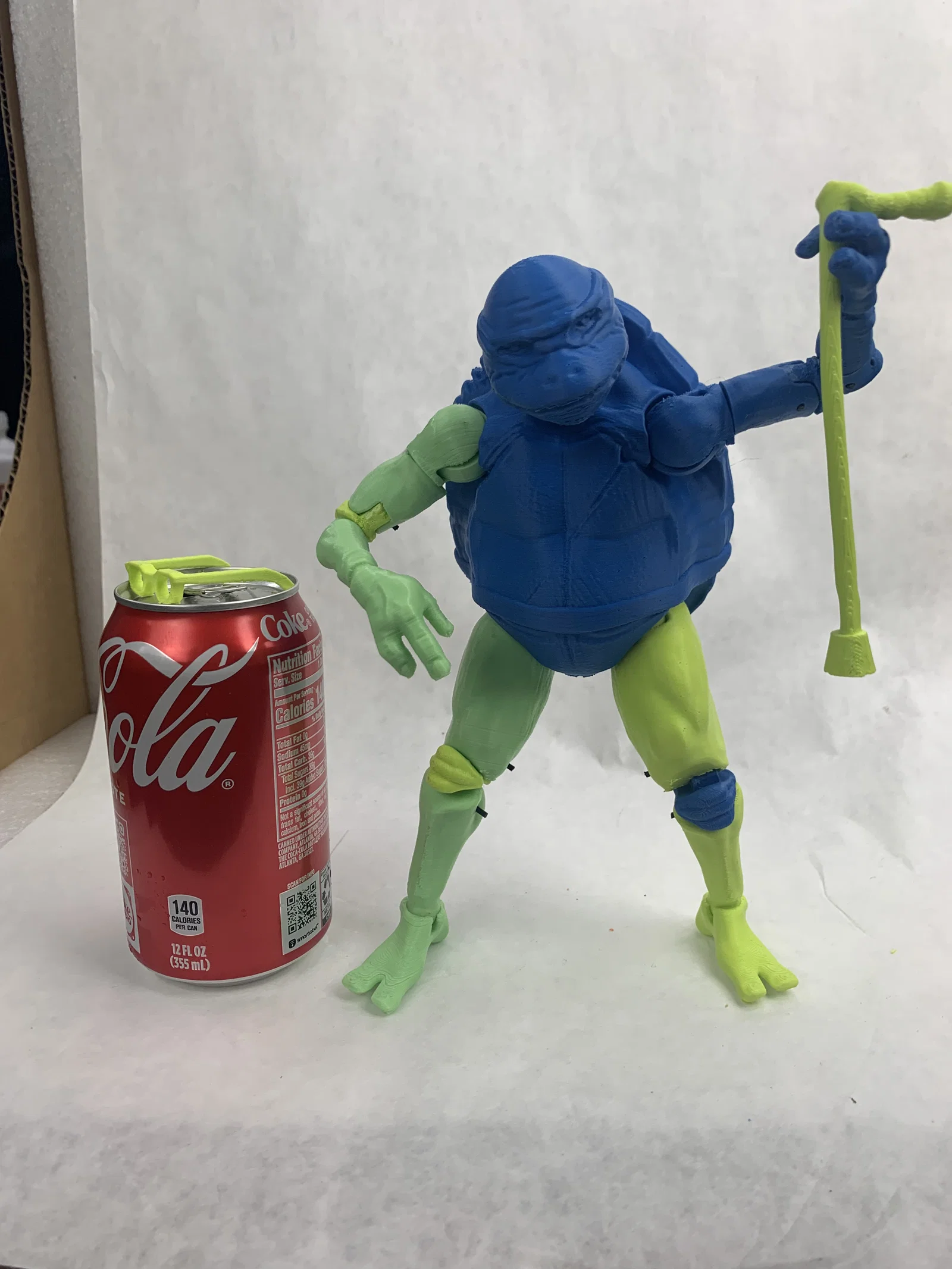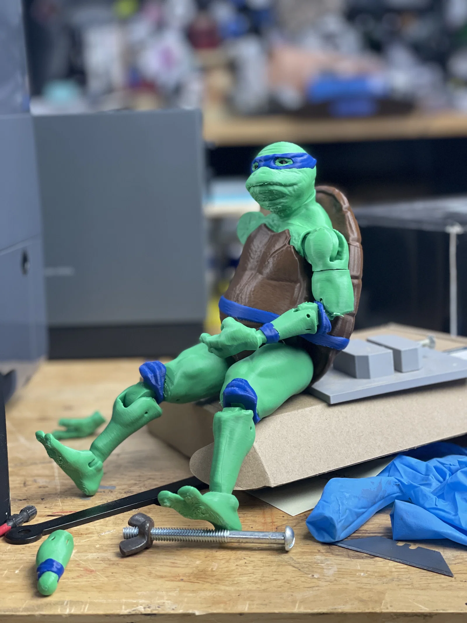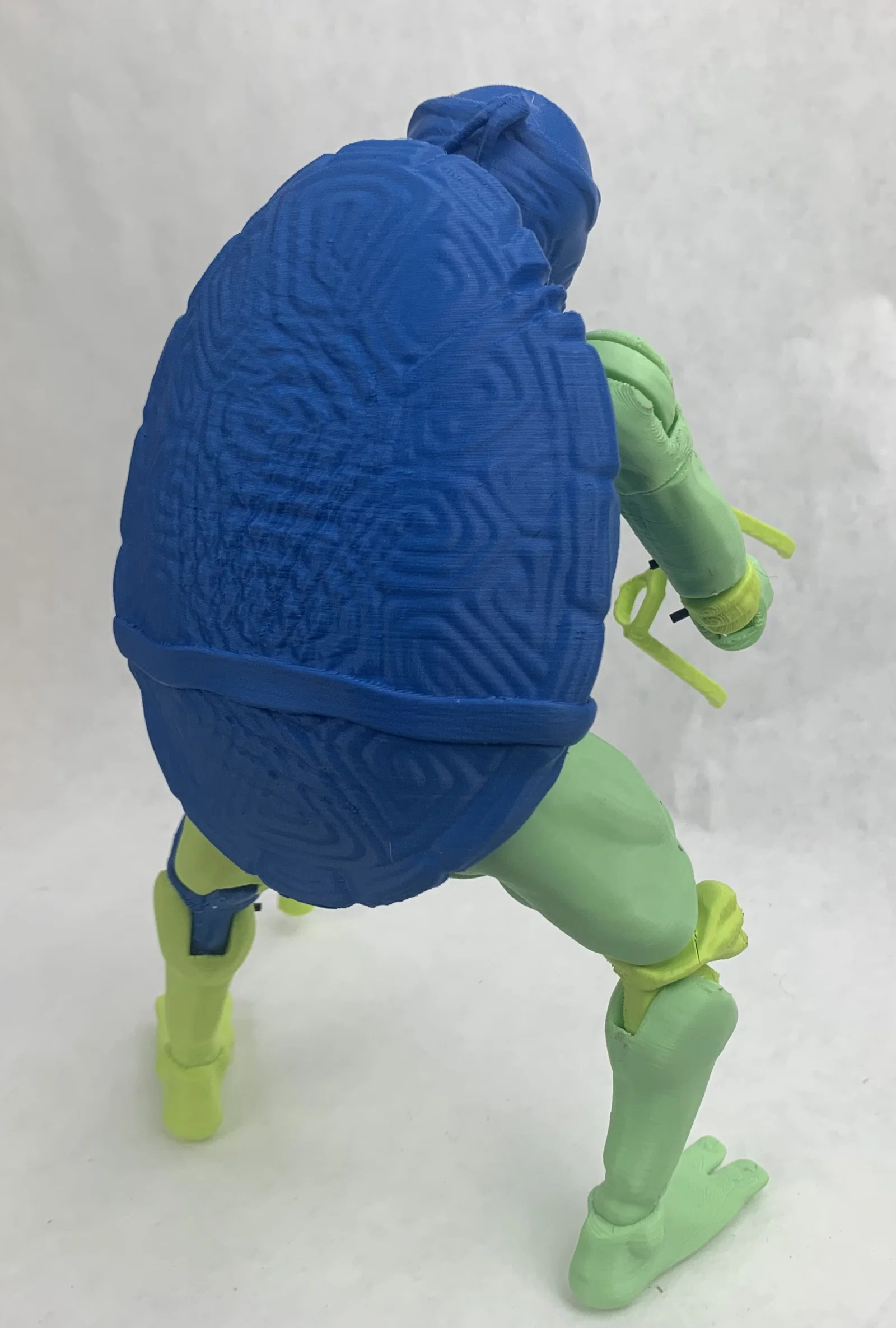 File 3D action figure Ninja Turtle phiên bản “già”, bụng bự và nhăn nheo. In thử với PLA trên Prusa Mini (.20mm Quality). Một số khớp/lỗ filament khá chặt, có thể cần khoan nới; nhớ mirror tay và chân để có bên phải.
