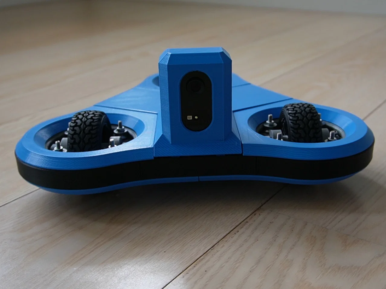 Một con robot di chuyển đa hướng, được làm dựa trên ba cái differential swerve drive modules của mình. Mấy module này có chỉnh sửa chút xíu để motor nằm ngang thay vì dựng đứng. Nhờ vậy mình làm được phần đế robot khá mỏng.