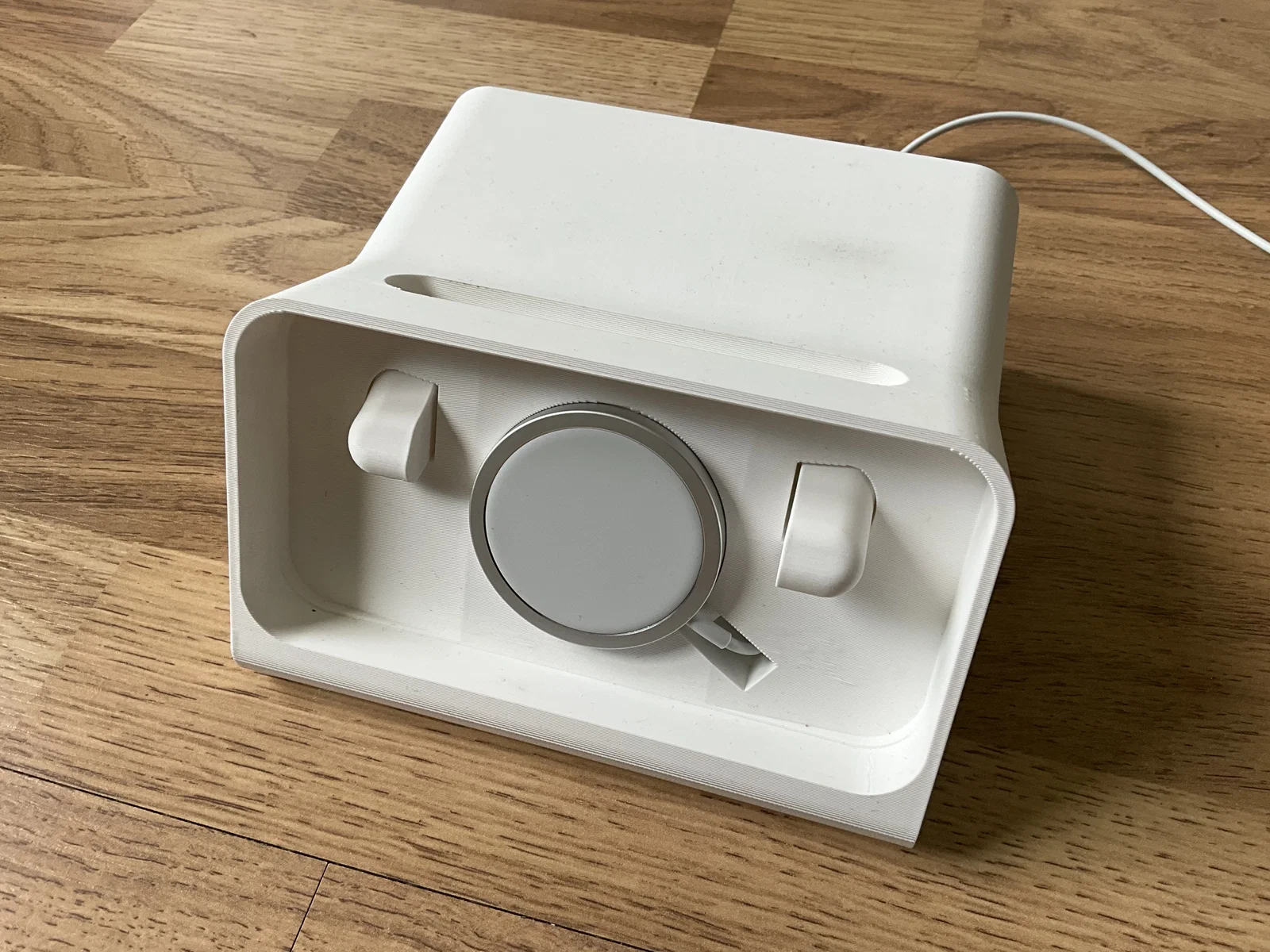 Đây là bản Remix từ mẫu iPhone Standby Mode Dock của Scott Yu-Jan. Mình đã chỉnh lại kích thước để iPhone 13 có gắn ốp vừa khít (152x78mm). Phía trên có một khe để gắn bộ sạc Apple Watch, nhờ đó bạn có thể sạc AirPods. MagSafe Charger cần được dán cố định bằng băng keo hai mặt.