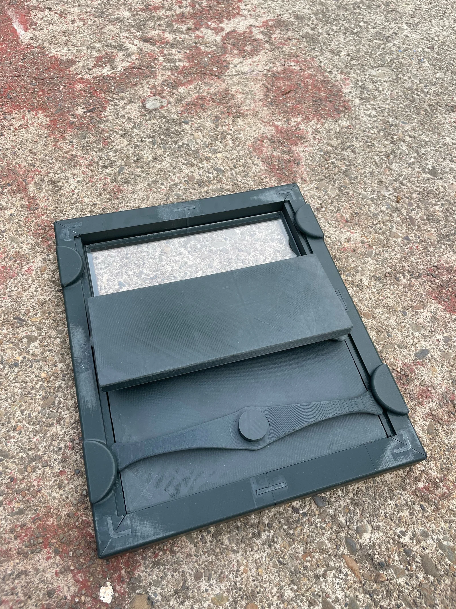 Khung in contact split back 9x11 inch cho bản in tối đa 8x10. Cần kính 1/8" (9x11), có thể dán nỉ mỏng ở backplate. Khuyến nghị in lò xo bằng PETG và chà nhám để lắp trơn; có STL cho Cura do lỗi .3MF.