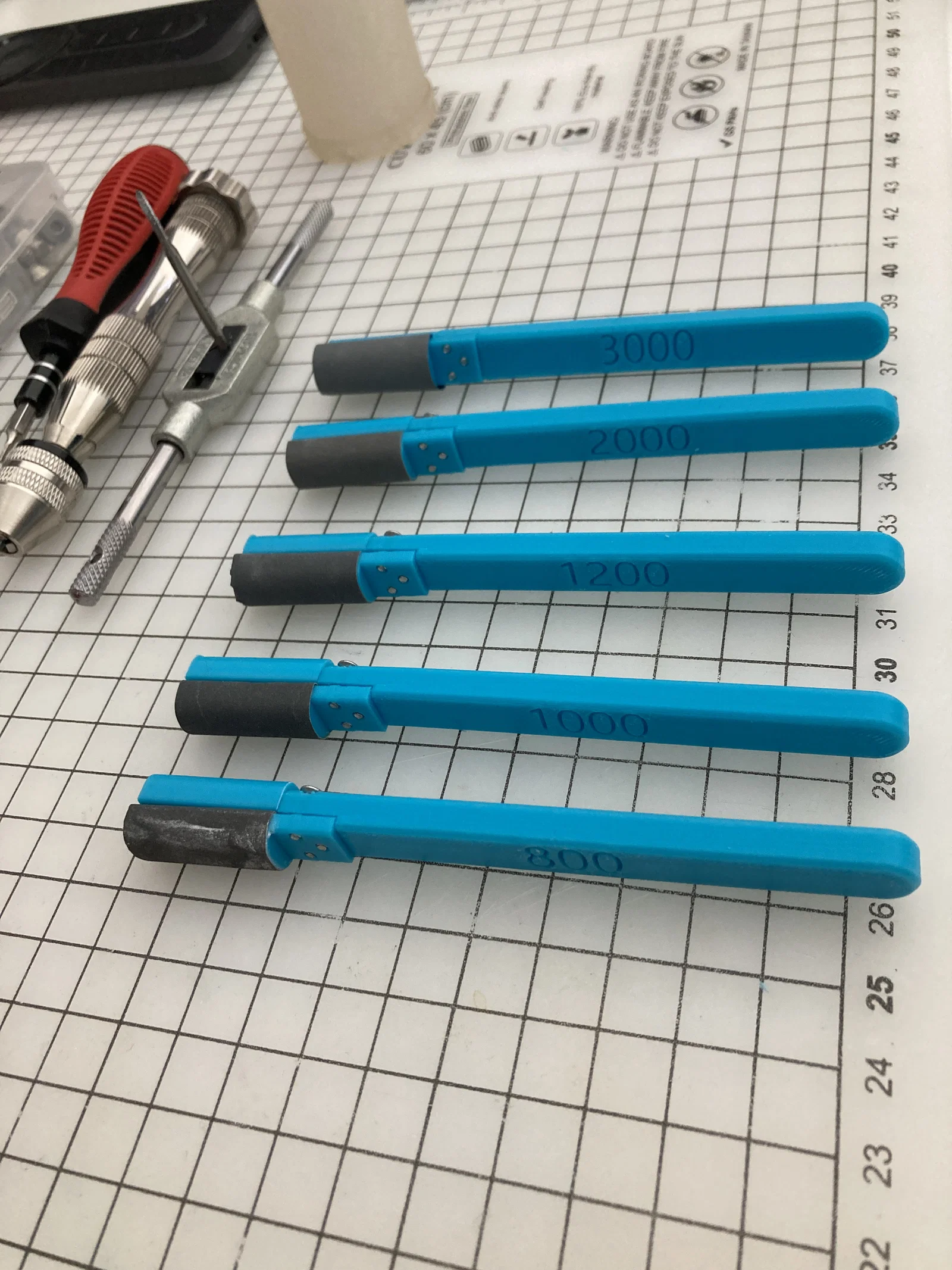 Những cây giũa dạng stick này có thể gắn giấy nhám kích thước 37mm x 25mm (giờ có thêm jig). Mẫu dùng một ngàm kẹp snap-on để cố định giấy nhám lên khối. Bạn có thể khắc chữ tuỳ ý lên phần cán như cây bút bằng PrusaSlicer với công cụ text.