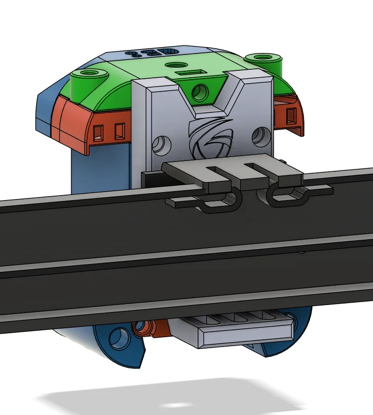 Bracket gắn Dragon Burner cho KP3S 3.0 trên ray MGN12C, đã chỉnh khoảng cách lỗ và hạ vị trí để dễ siết ốc từ phía sau trục X. Kèm thanh chặn công tắc hành trình X (klicky mount) để dừng đúng mép trái bed.