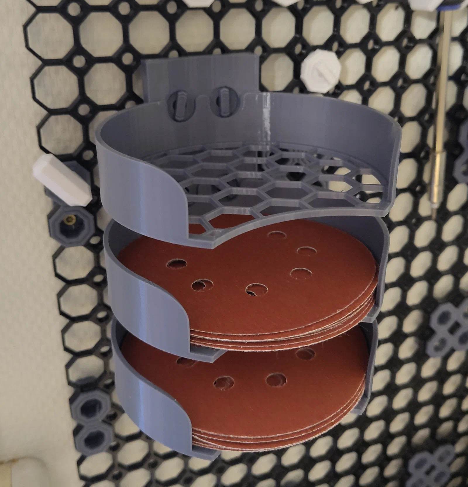 Thiết kế của giá được tối ưu hóa để gắn trực tiếp lên bảng Multiboard thông qua các chốt khóa chuyên dụng. Phần đáy giá có cấu trúc dạng lưới tổ ong không chỉ giúp giảm bớt lượng nhựa cần in mà còn đảm bảo độ thông thoáng, tránh việc đĩa nhám bị ẩm mốc nếu lâu ngày không sử dụng. Với kiểu dáng mở ở phía trước, bác có thể dễ dàng lấy từng tờ nhám ra mà không cần phải nhấc cả xấp hay tháo rời giá. Đây là một món phụ kiện in 3D tuy nhỏ nhưng mang lại sự thay đổi lớn cho quy trình làm việc hằng ngày của anh em.