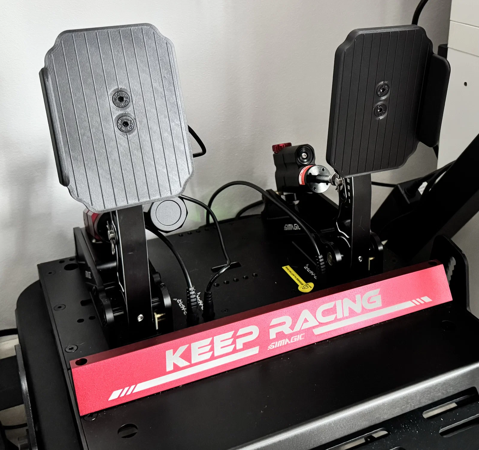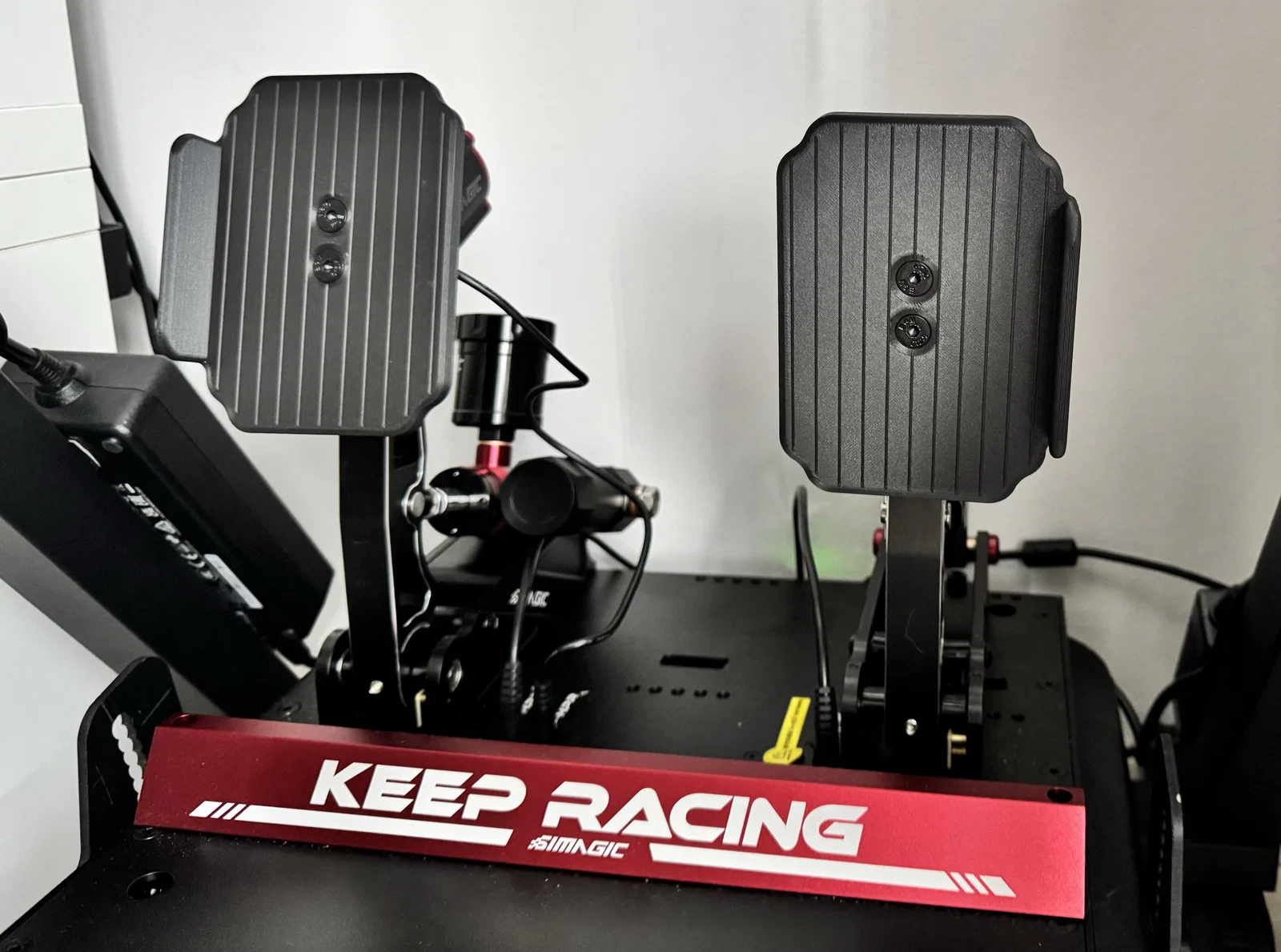 Mình cực kỳ thích bộ bàn đạp P1000f của Simagic vì nhiều lý do, nhưng mặt bàn đạp zin đi kèm lại không nằm trong số đó. Mình thấy chúng hơi nhỏ và trơn, độ cong cũng không thực sự “thể thao” – ít nhất là khi dùng để đua open-wheel.
