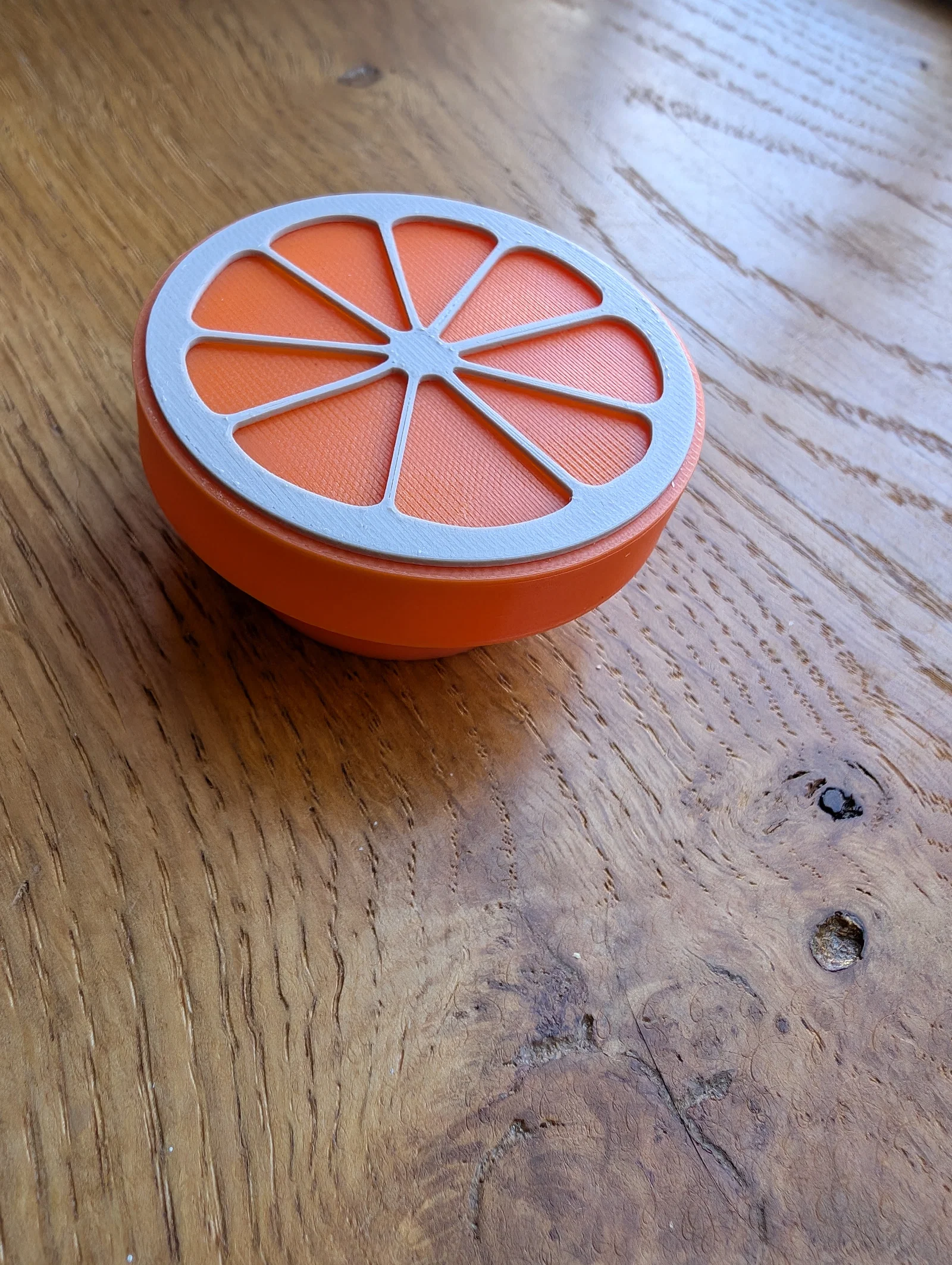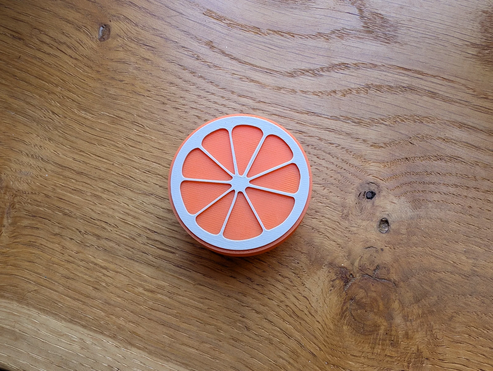 - Chất liệu in: Nên sử dụng nhựa PLA với màu cam tươi cho phần thân và màu trắng cho phần họa tiết múi cam để đạt độ tương phản màu sắc tốt nhất.