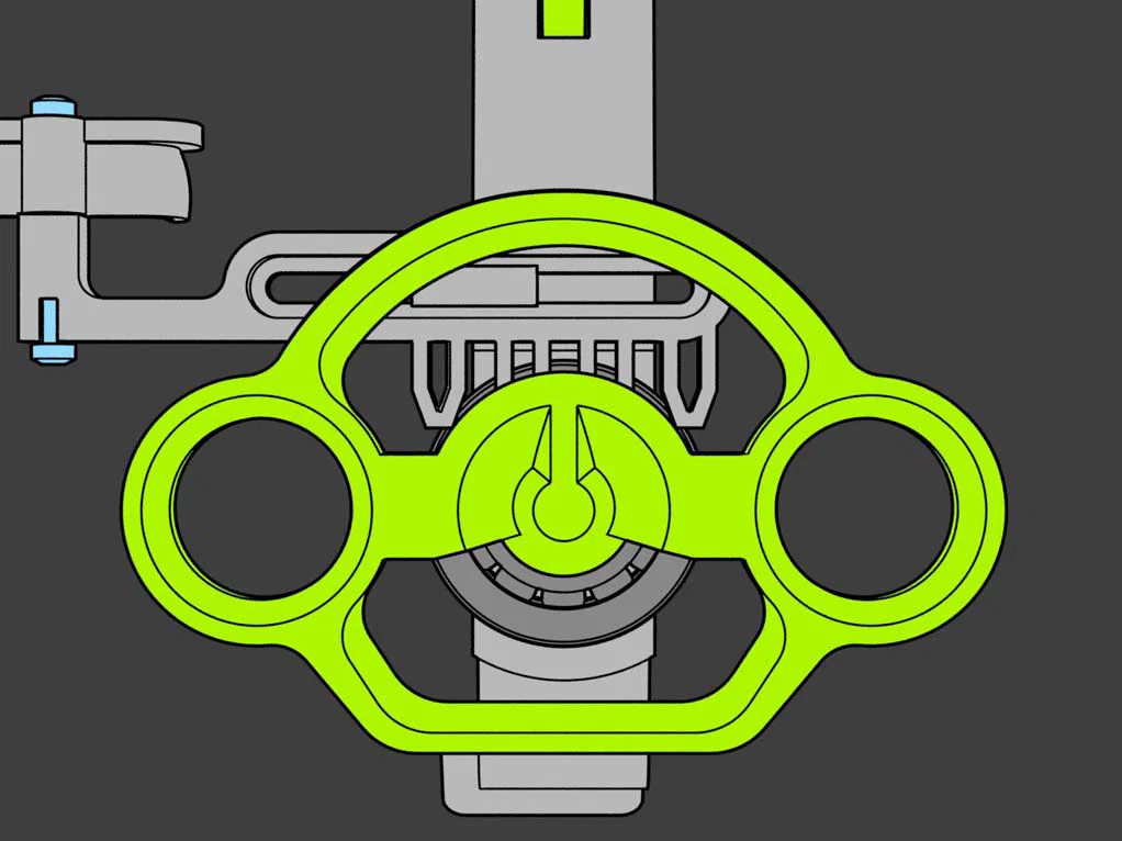 Trục xoay phải tự quay về vị trí trung tâm khi đẩy sang hai bên. Nếu bị kẹt, hãy dùng giấy nhám hoặc dũa mài bớt phần chữ “T” trên khung rồi thử lại.