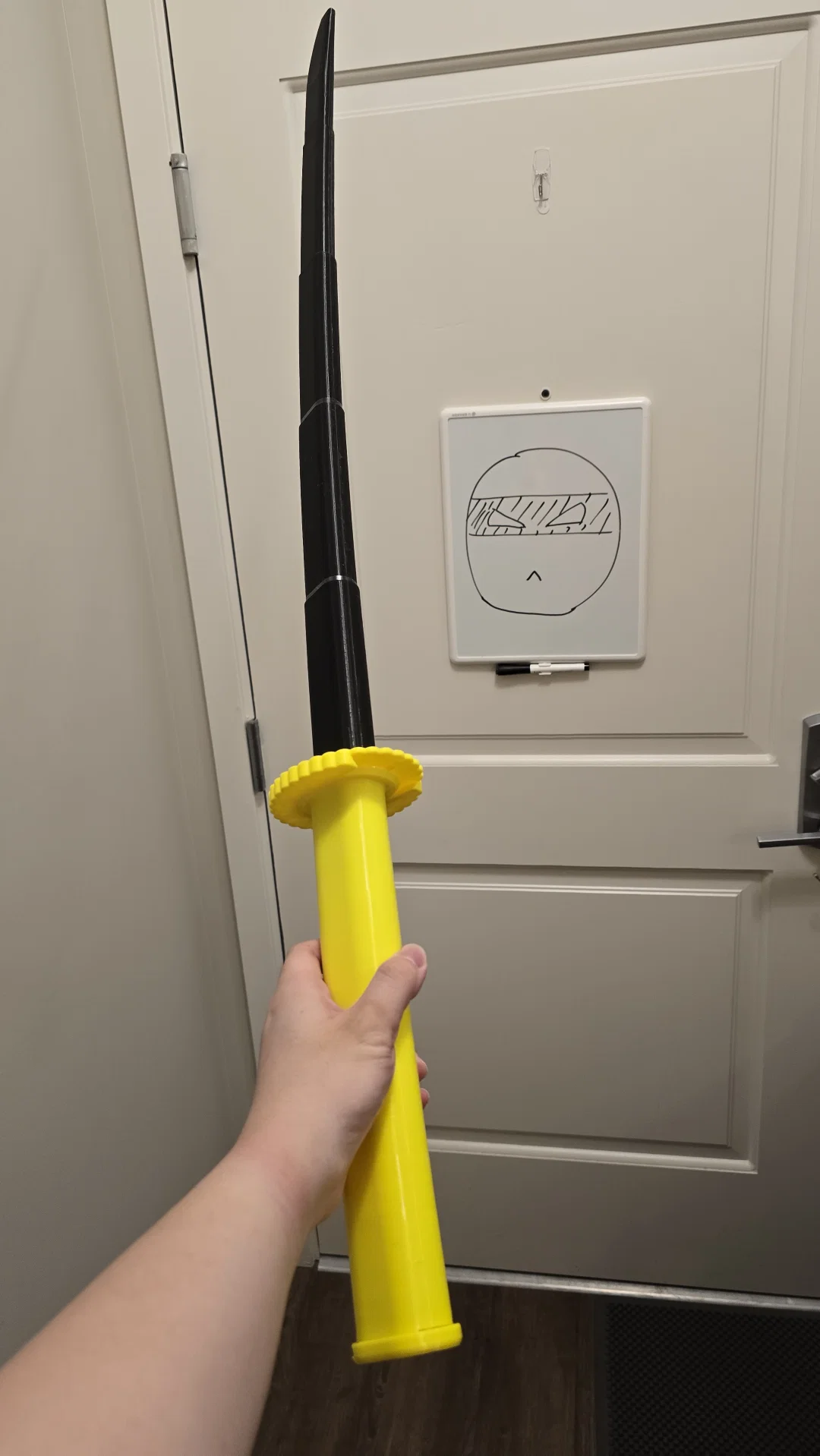 Về cây kiếm: Kiếm dài 28cm khi thu gọn và 105cm khi kéo dài. Tui đã cố gắng làm cho tỷ lệ tương đương với một cây Katana thật. Lưỡi kiếm được làm tròn nhưng vẫn giữ được nét đặc trưng. Ngoài ra, thiết kế này ít bị gãy hơn và an toàn hơn khi bạn dùng để vung vẩy. Làm ơn đừng dùng nó để đánh người nhé. Ít nhất là đừng làm vậy nếu không được sự đồng ý của họ.
