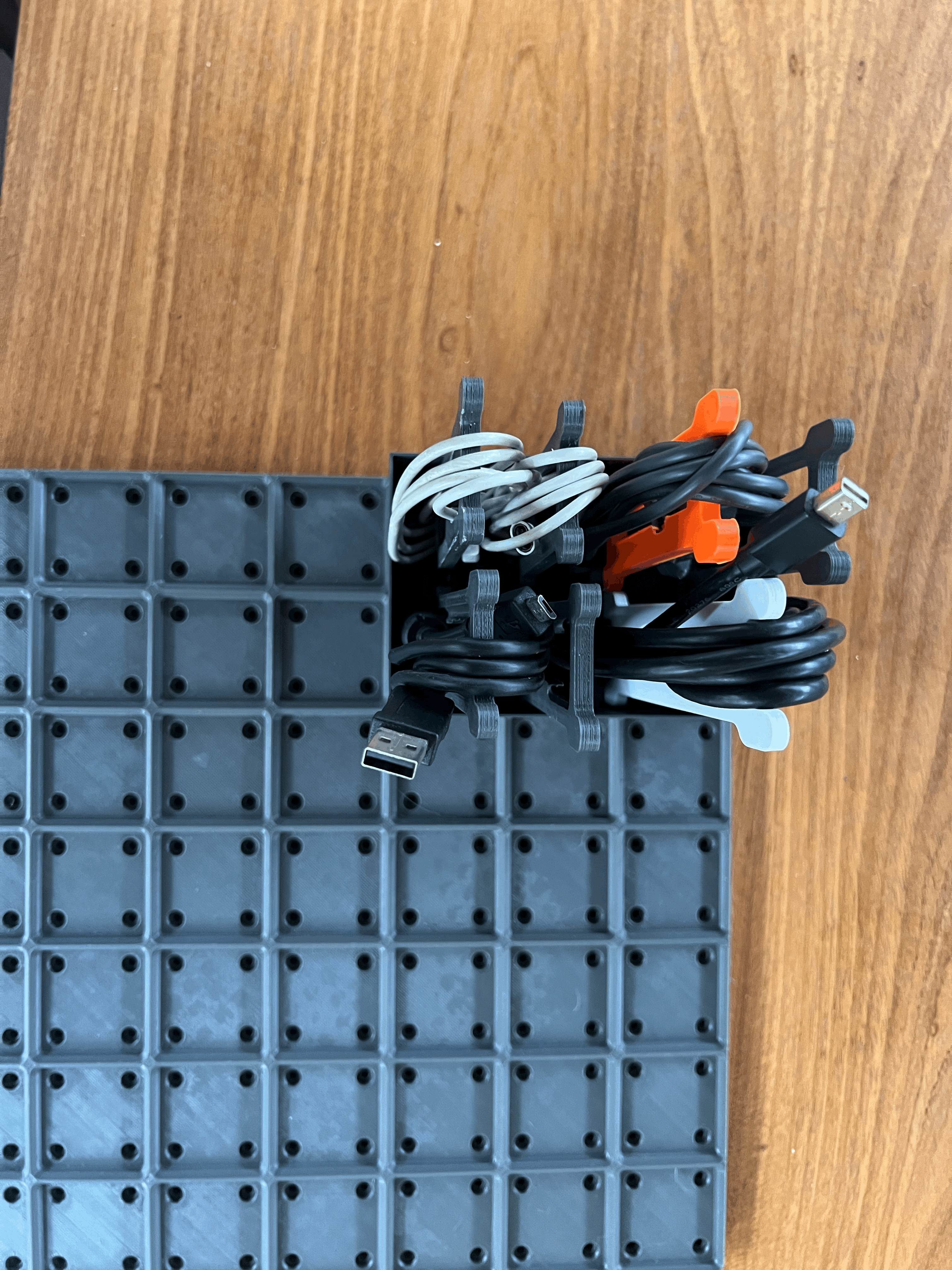 Bộ sắp xếp cáp kèm ngàm/ống cuốn dây và một hộp có đế Gridfinity để cất và giữ dây cáp gọn lại, gom chung một chỗ, không bị quăng lung tung.