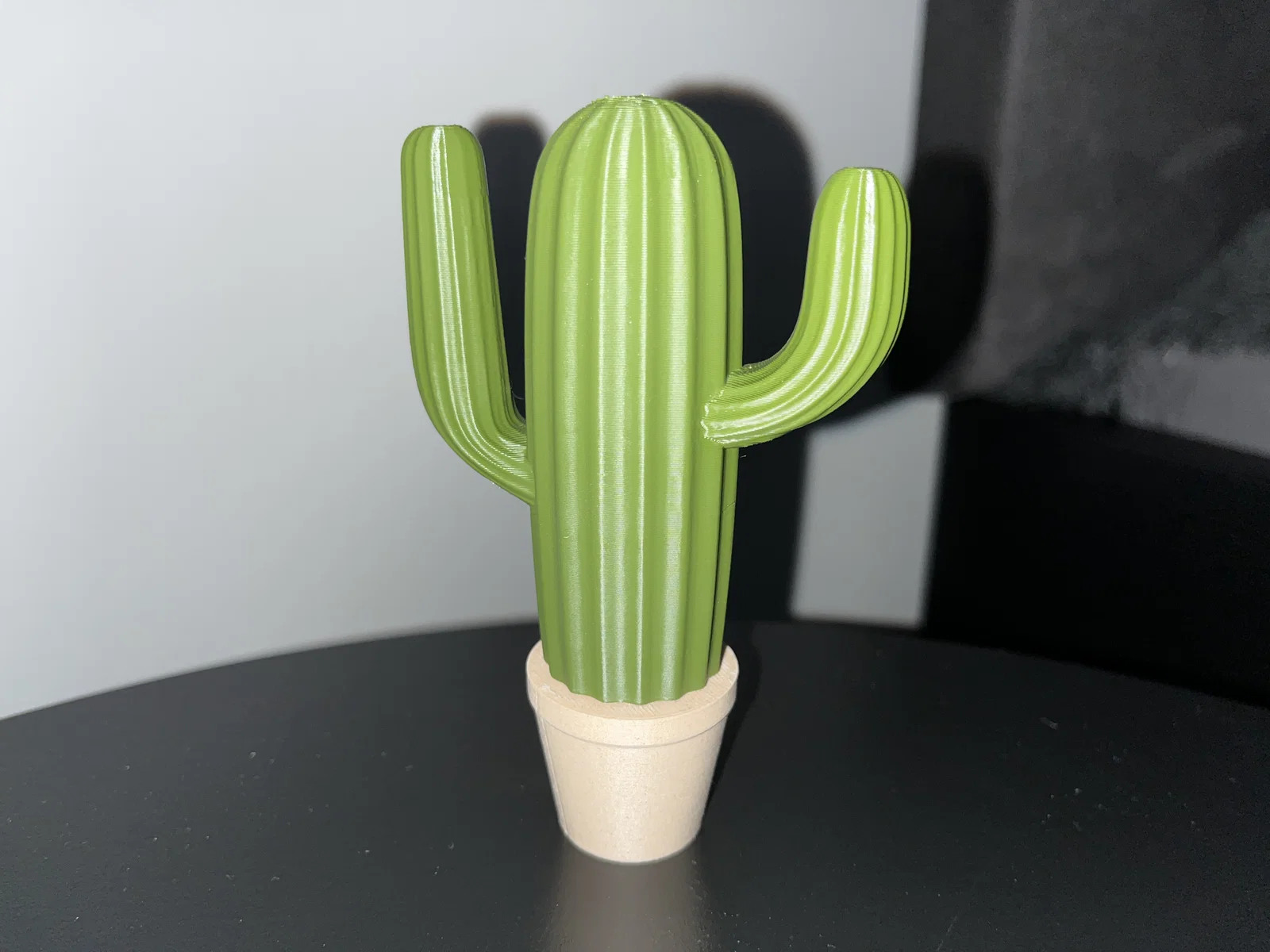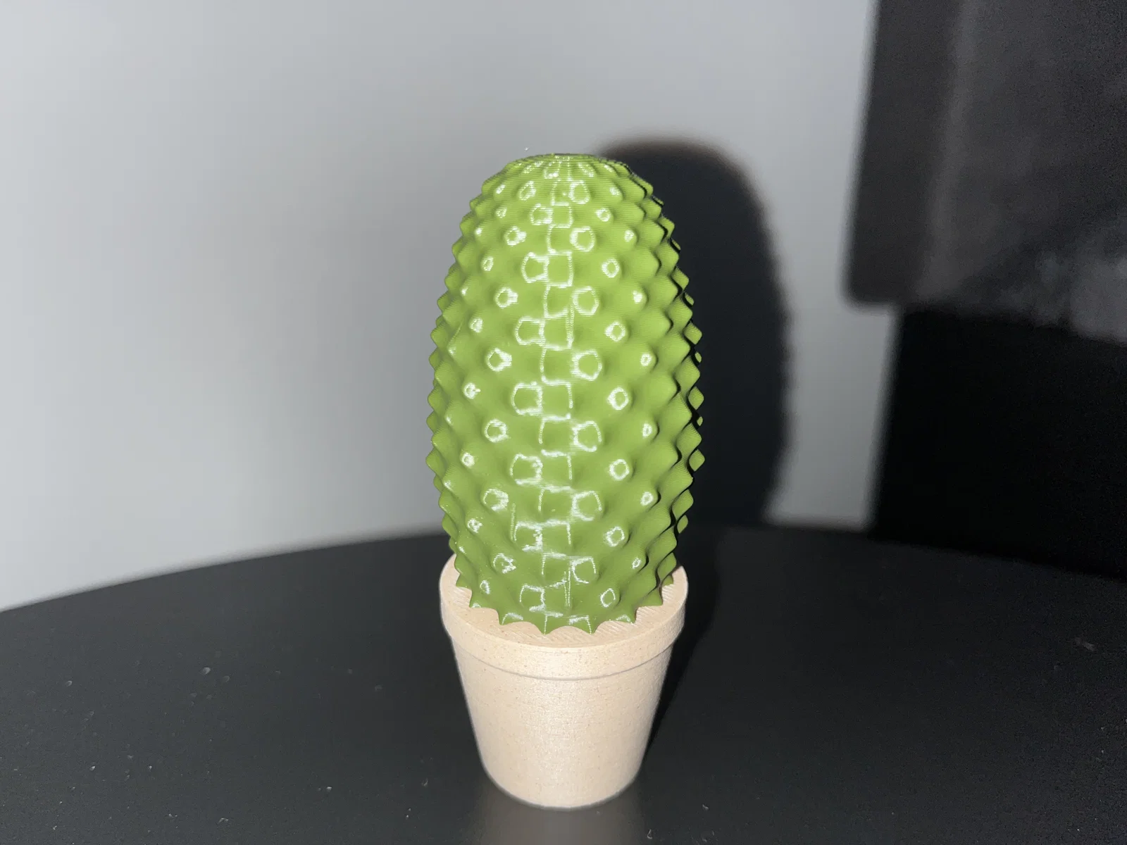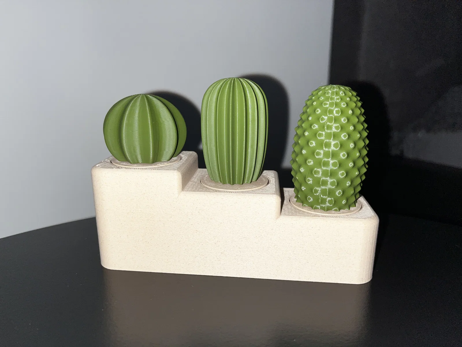 ở hình thứ hai. Cái chậu này có thể cắm vào bất kỳ chậu hoa nào bạn thích, đó là lý do tại sao mình chỉ làm một mẫu cơ bản thôi. Đường kính của chậu ở tỉ lệ 100% là 6cm và dung sai ở phần chốt là 0.2mm. Để vừa với cái chậu ở hình thứ hai, mình đã thu nhỏ nó xuống 58%. Độ khớp khá là khít. ### In ấn Chỉ riêng file cactus_3 là cần dùng support. Mình đã sử dụng tree support. Filament đã dùng: Prusament Army green PLA cho các cây xương rồng, Wood PLA cho chậu.