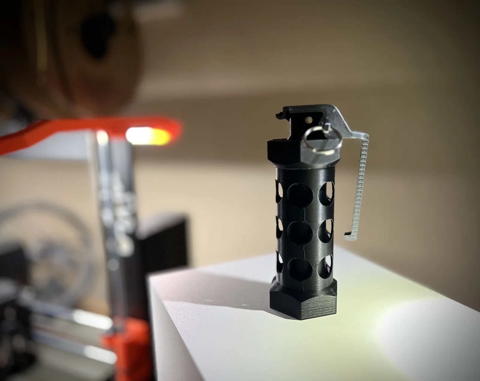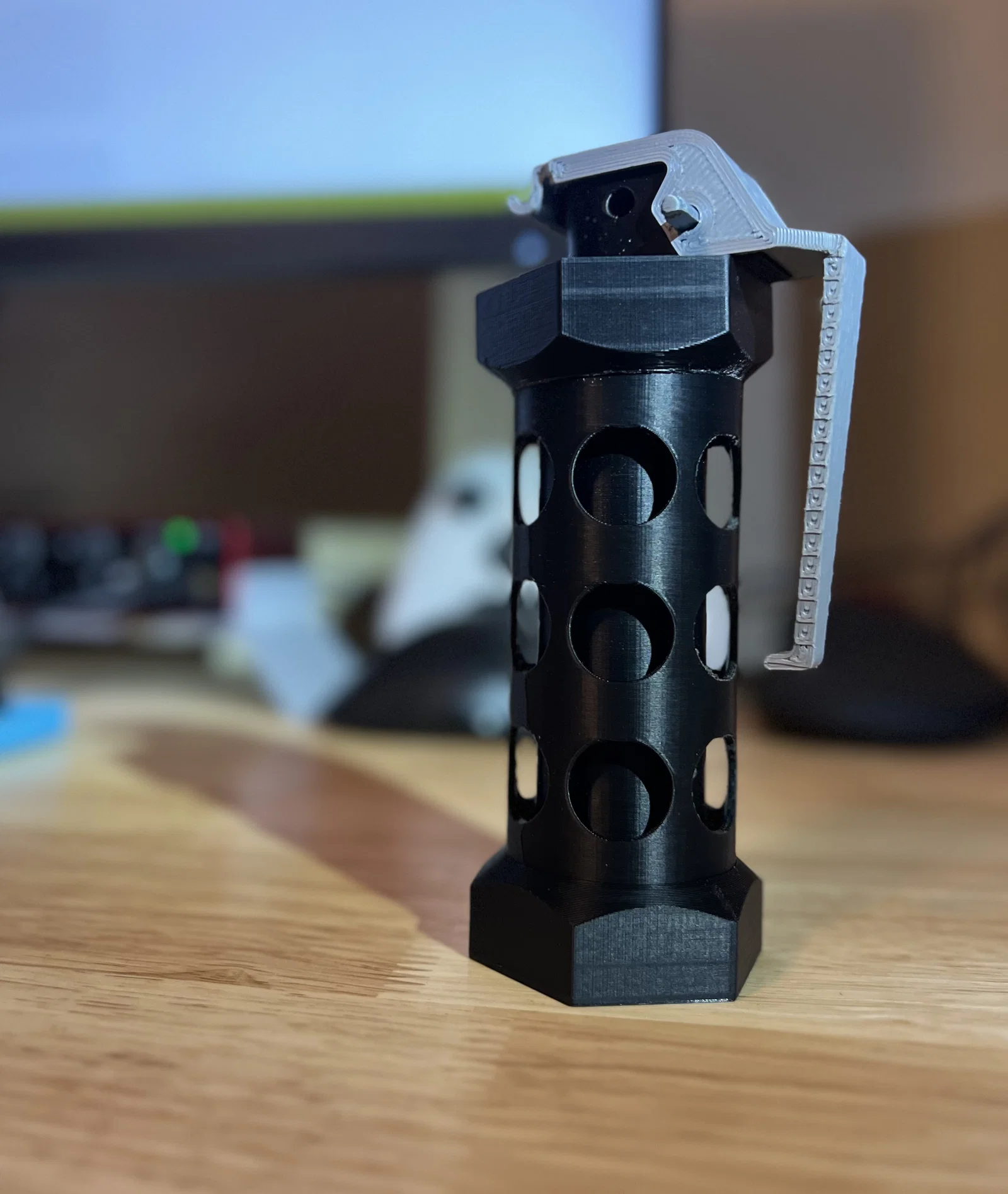 Mẫu mô phỏng thô flashbang M84 trong CSGO, in nhiều phần và lắp lại không cần keo. Có lưu ý về supports cho handle/top cover, khuyến nghị gắn keyring, kèm các bản cập nhật sửa kích thước và lỗi ren.
