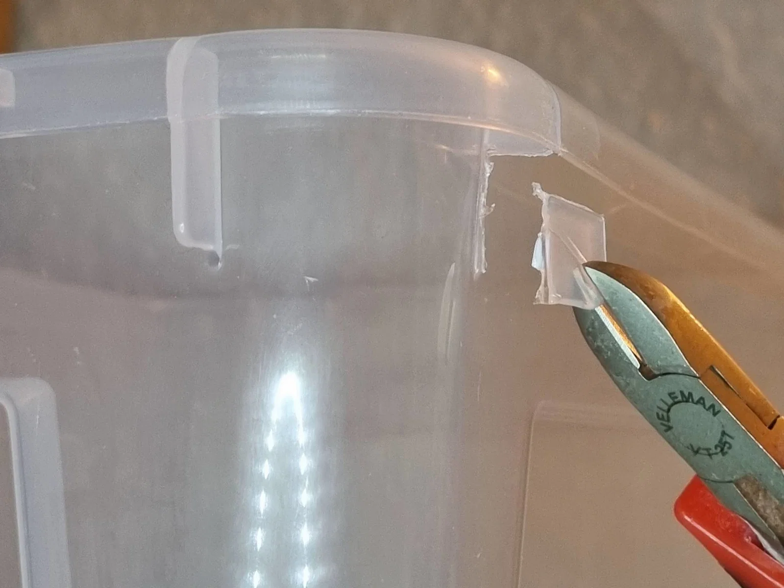 - Cắt bỏ hai phần mấu của thùng (xem hình). Đừng dùng lực quá mạnh kẻo làm nứt nhựa. Hãy dùng kìm cắt đi kèm máy in của bạn. Bóp chặt rồi khéo léo lắc nhẹ sang hai bên để làm lỏng các mấu này.