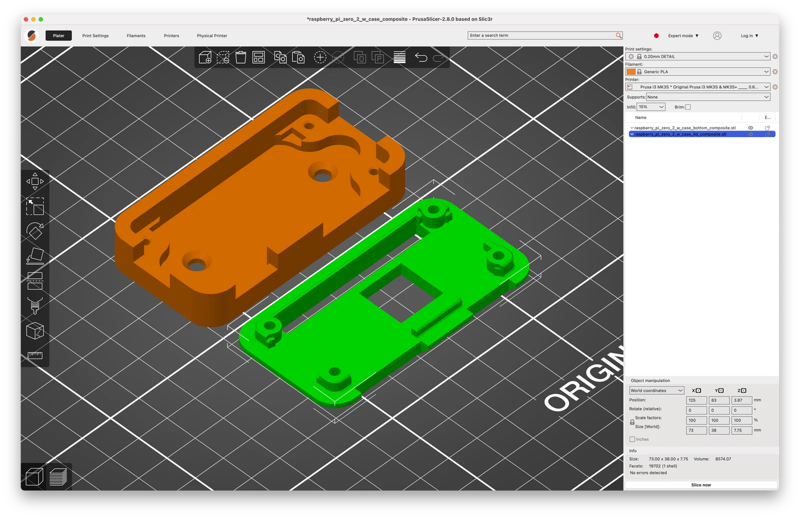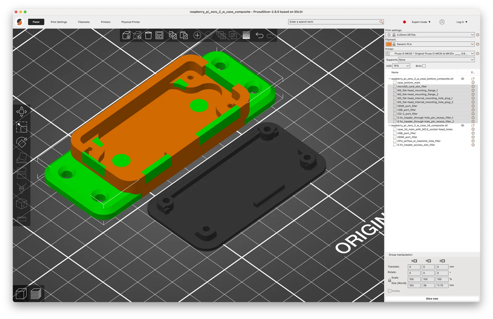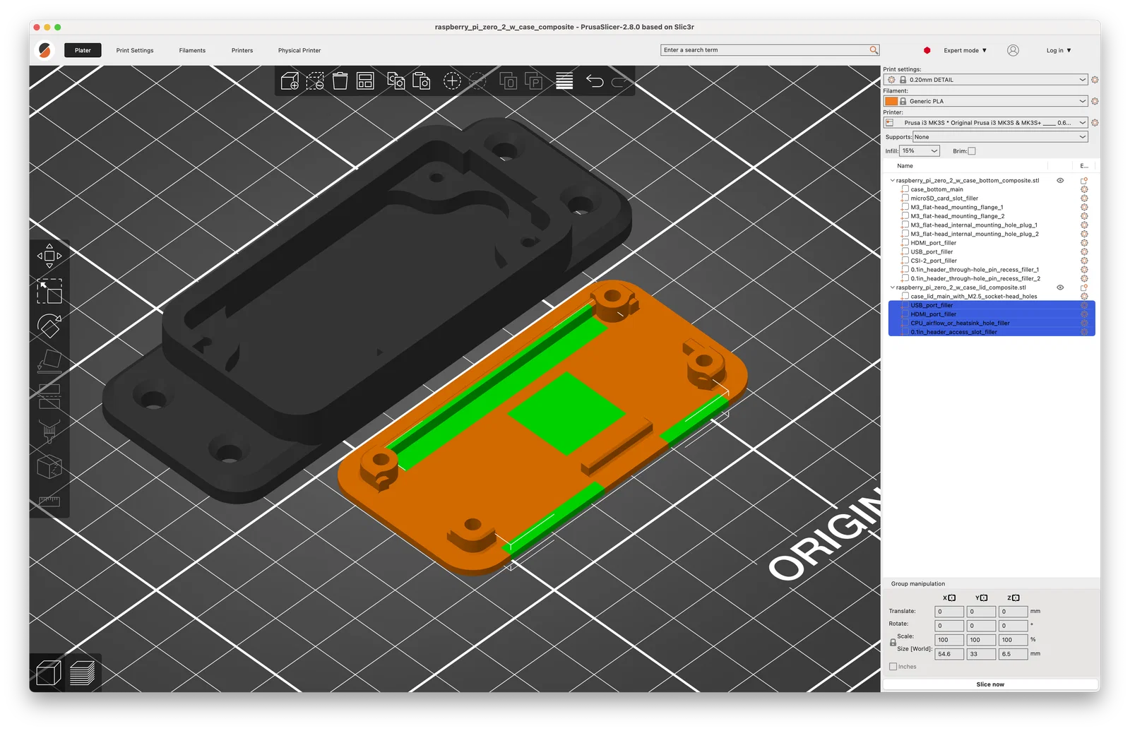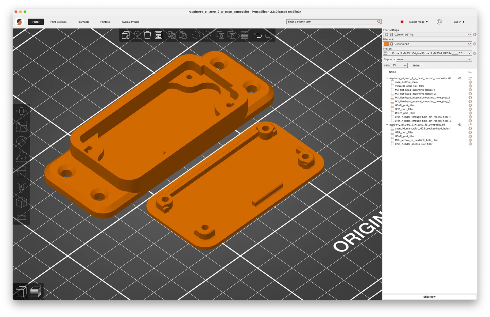 Mở file PrusaSlicer *.3mf đi kèm. File này đã sắp đúng hướng phần đáy case và nắp trên bàn in, và mỗi nửa của case đã được tách thành các phần có tên để bạn có thể chọn riêng từng phần rồi xóa hoặc giữ nhằm tạo ra bộ case mong muốn (xem screenshot của model này).