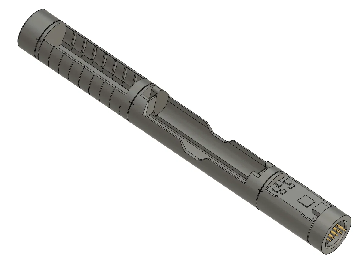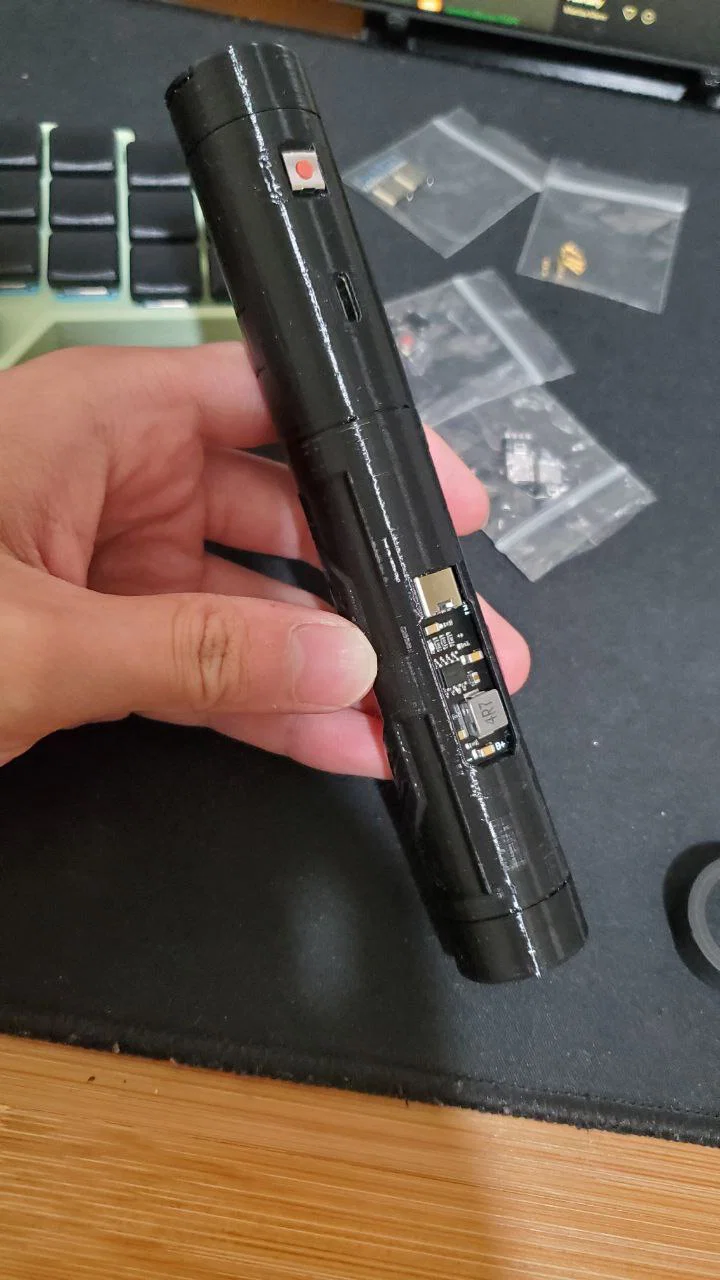 Chassis lightsaber dạng mô-đun vặn ren Threadlock 1 inch, dễ tùy biến chiều dài khi in. Hỗ trợ nhiều phần cứng như 18650, Proffieboard, Golden Harvest, speaker 22mm, USB-C và mạch sạc IP2312.