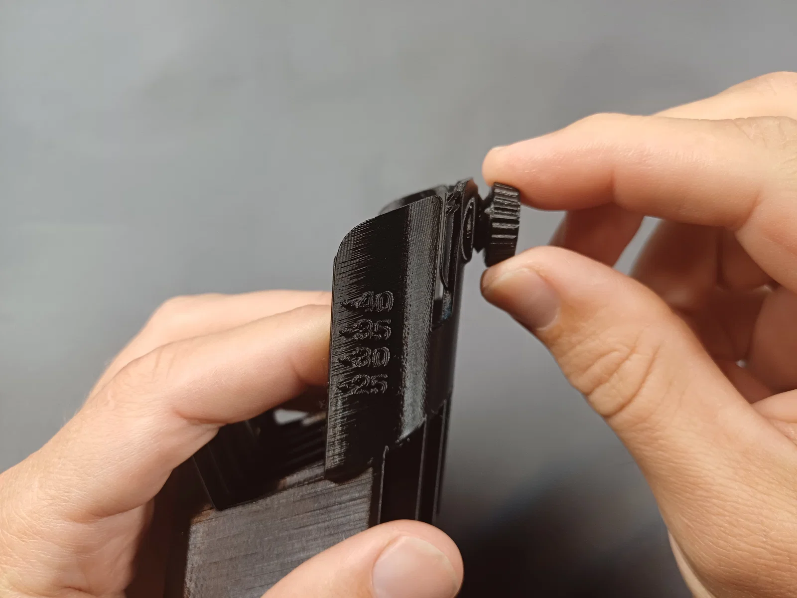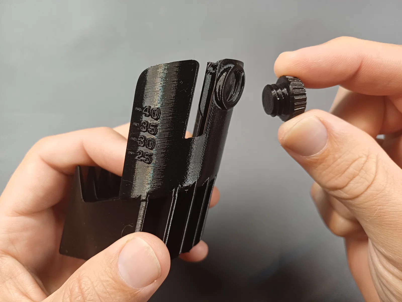 Mình dùng một con vít để cố định chiều cao, thấy hợp lý cho 3D printing (thay vì cơ chế nguyên bản).