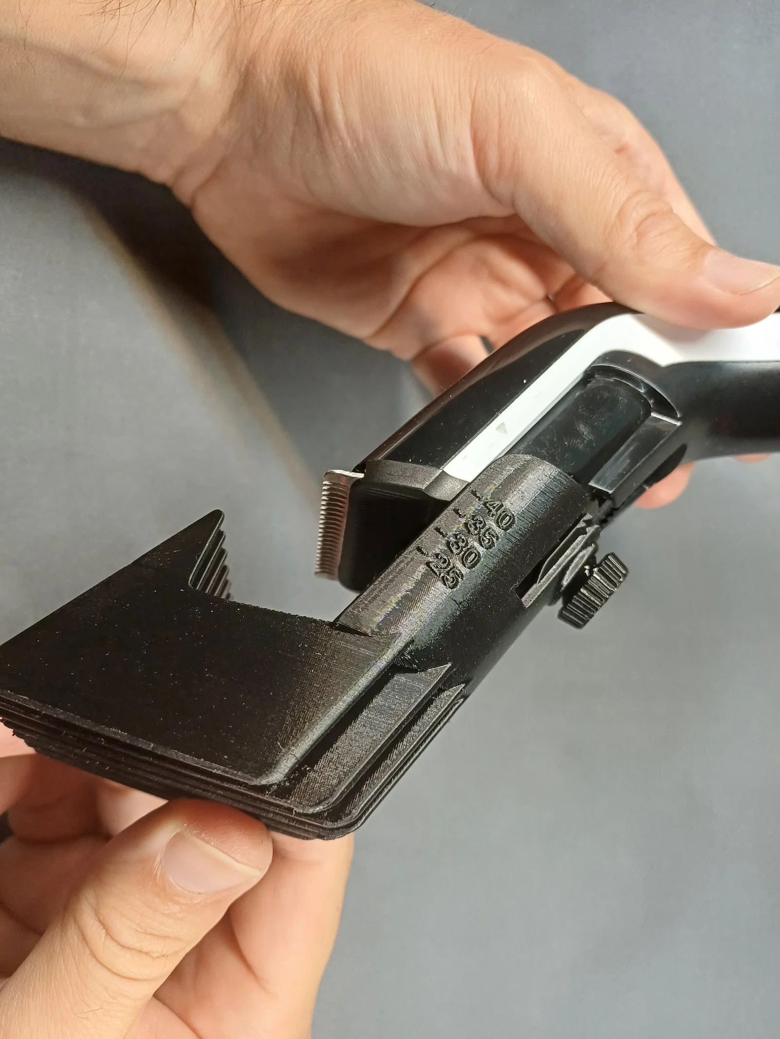 Mẫu lược (comb) kéo dài cho tông đơ PHILIPS QC5115, giúp chỉnh độ cao cắt từ 25mm đến 40mm. Dùng vít để khóa chiều cao, phù hợp cho 3D printing. In lược kèm brim 5mm và in vít dựng trên đầu.