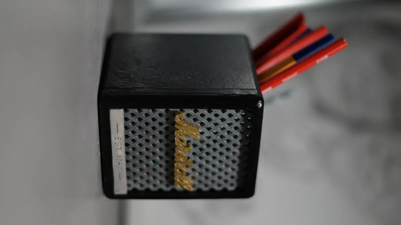 Người giữ bút chì Marshall, người tổ chức bàn lấy cảm hứng từ thiết kế loa Marshall.