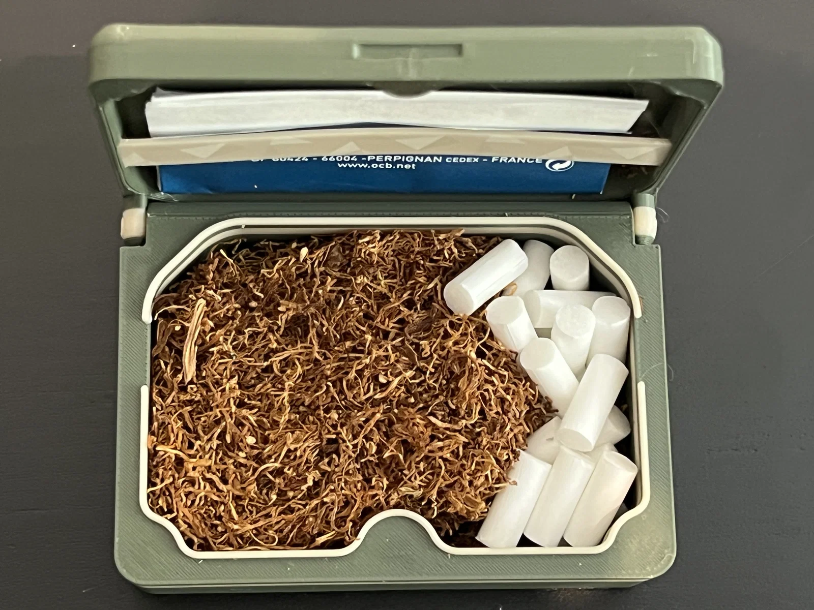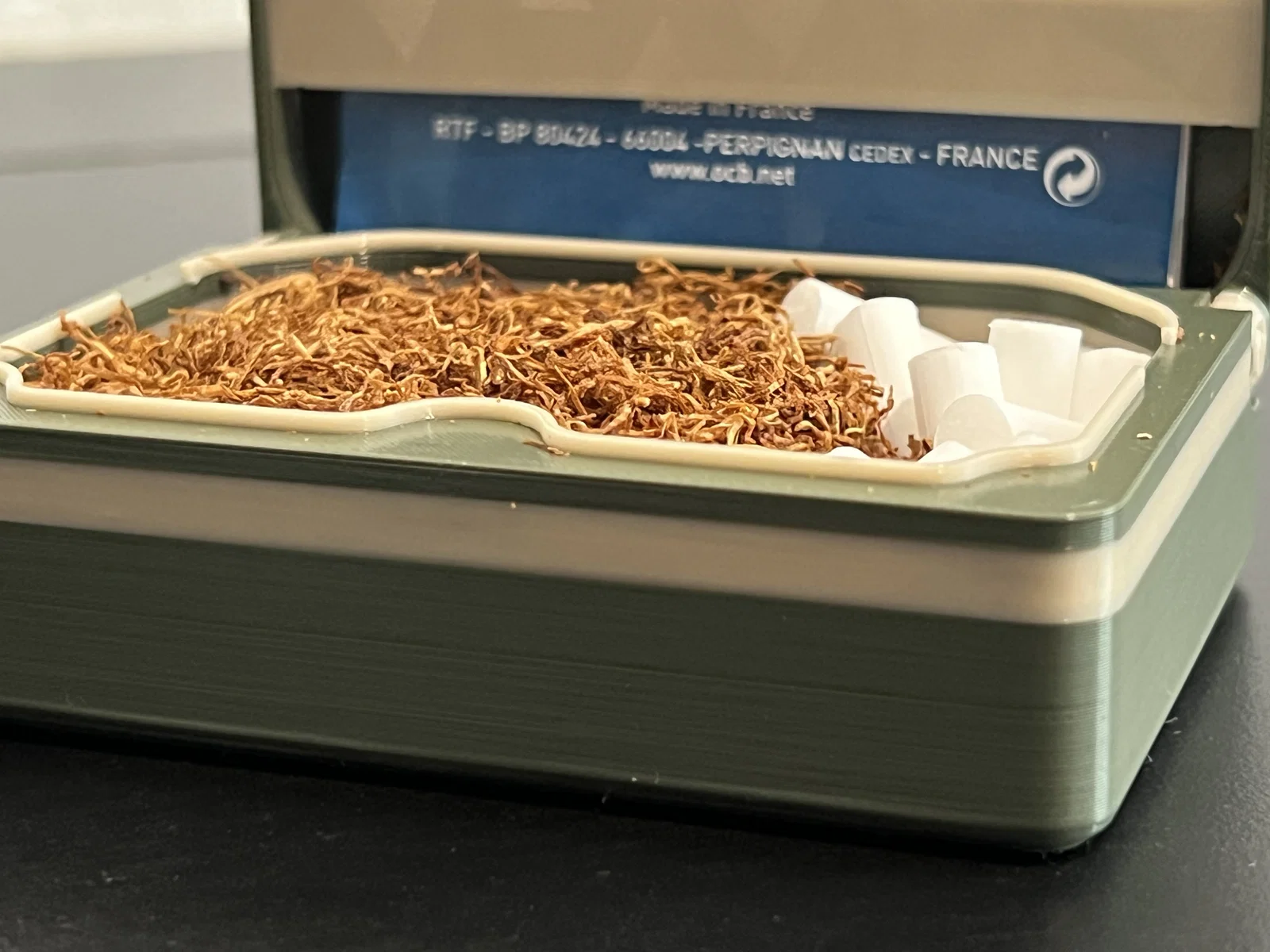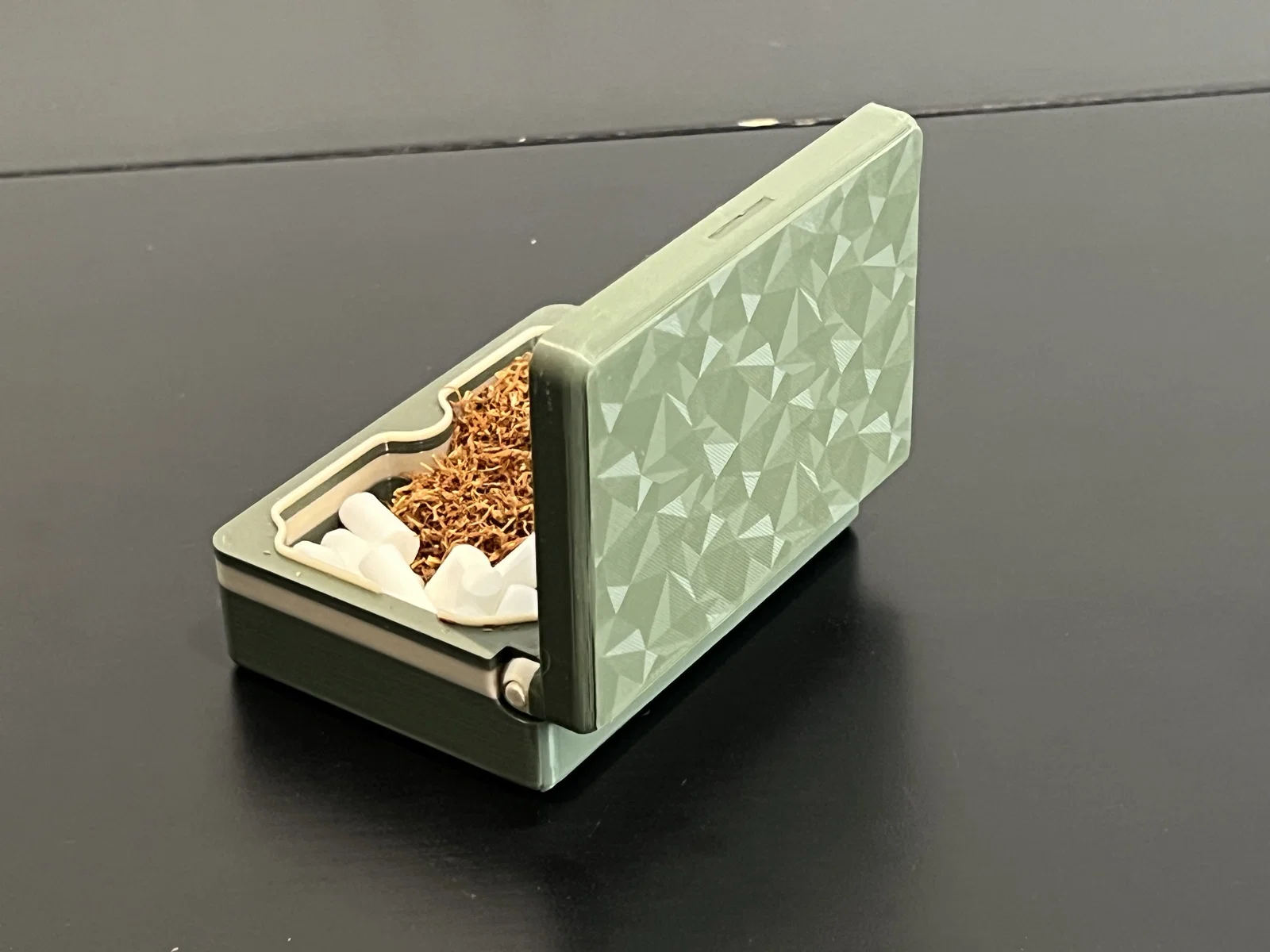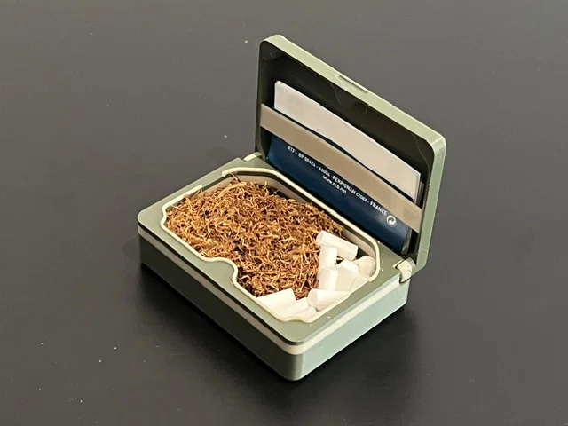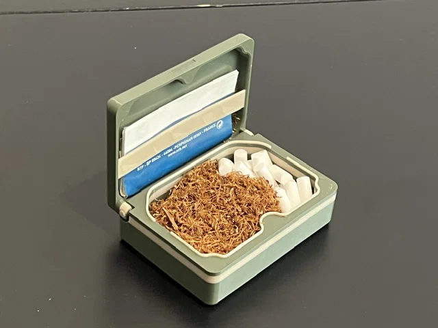 Hộp thuốc lá nhỏ gọn để mang theo đồ cuốn, thiết kế nhiều phần ráp khít không cần keo. Khóa bằng 6 nam châm 6x3mm, có lò xo giữ giấy. Không cần AMS; có điểm pause để đổi filament và gắn nam châm.