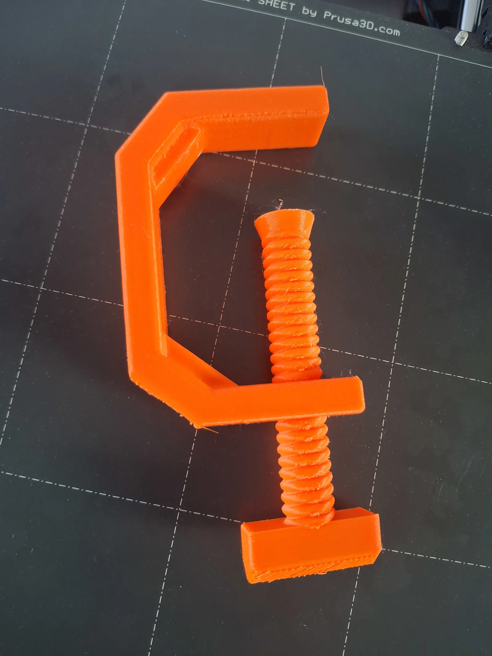 Mẫu kẹp C-clamp dạng print in place, dễ in mà rất cứng cáp. Hiệu năng kẹp “đáng ngạc nhiên” so với độ đơn giản của thiết kế; khuyến nghị layer height 0.1, infill 20%+, walls từ 2–3.