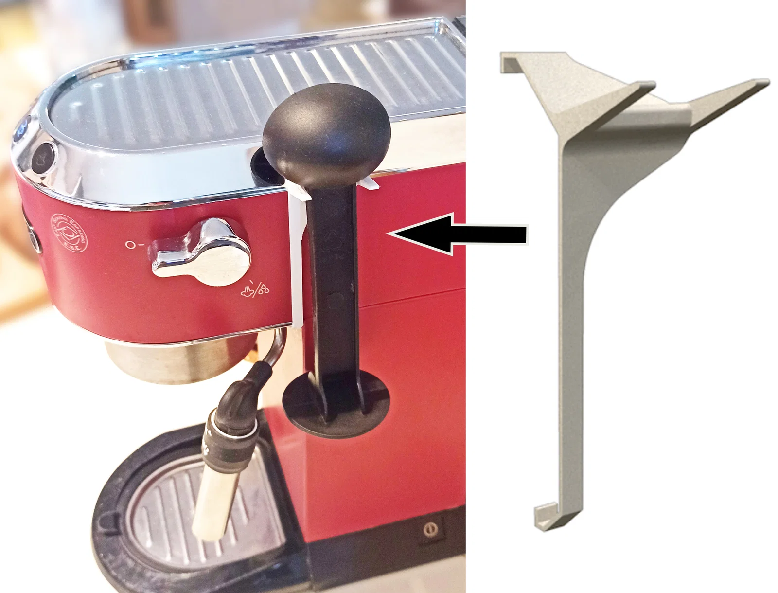 Một món phụ kiện in nhanh cho Delonghi Dedica. Nó tận dụng cái gờ ở phía trên và một lỗ có sẵn bên dưới.