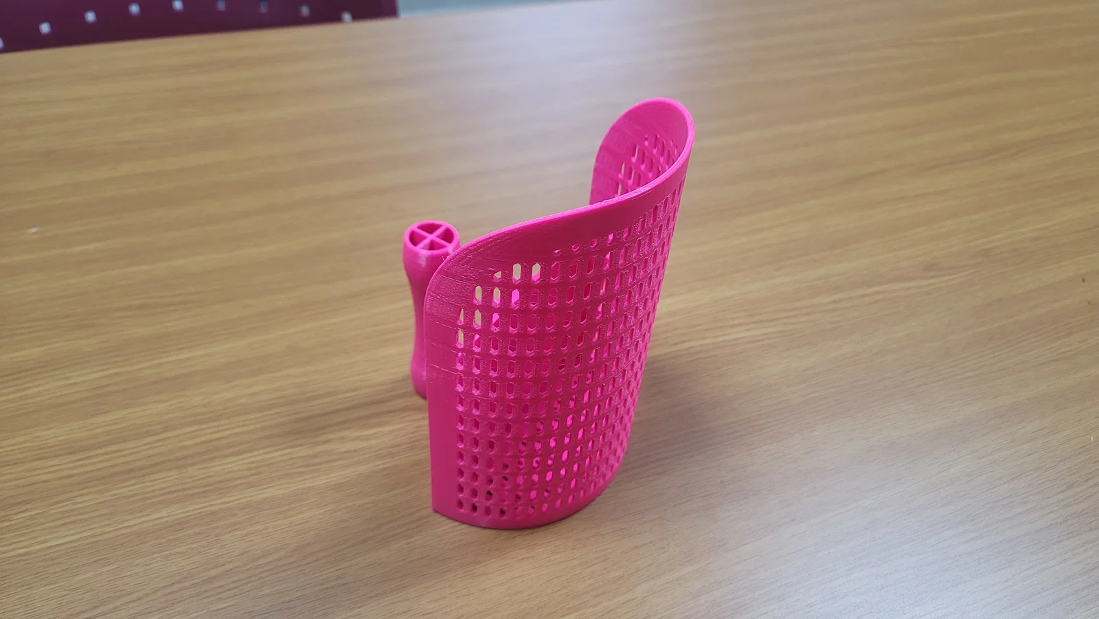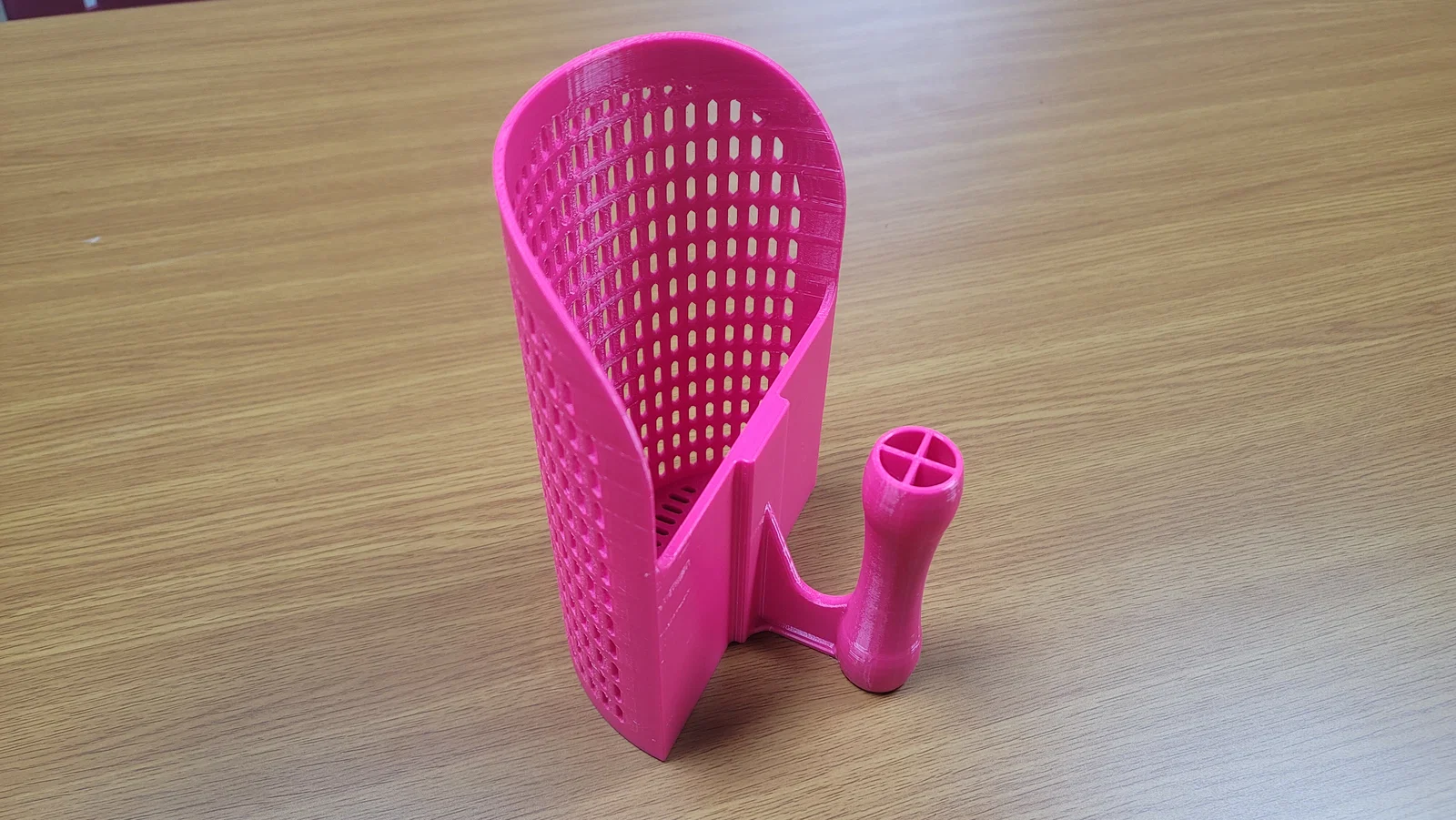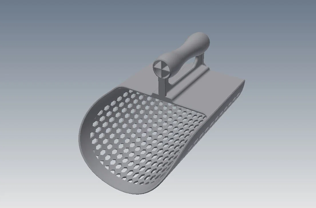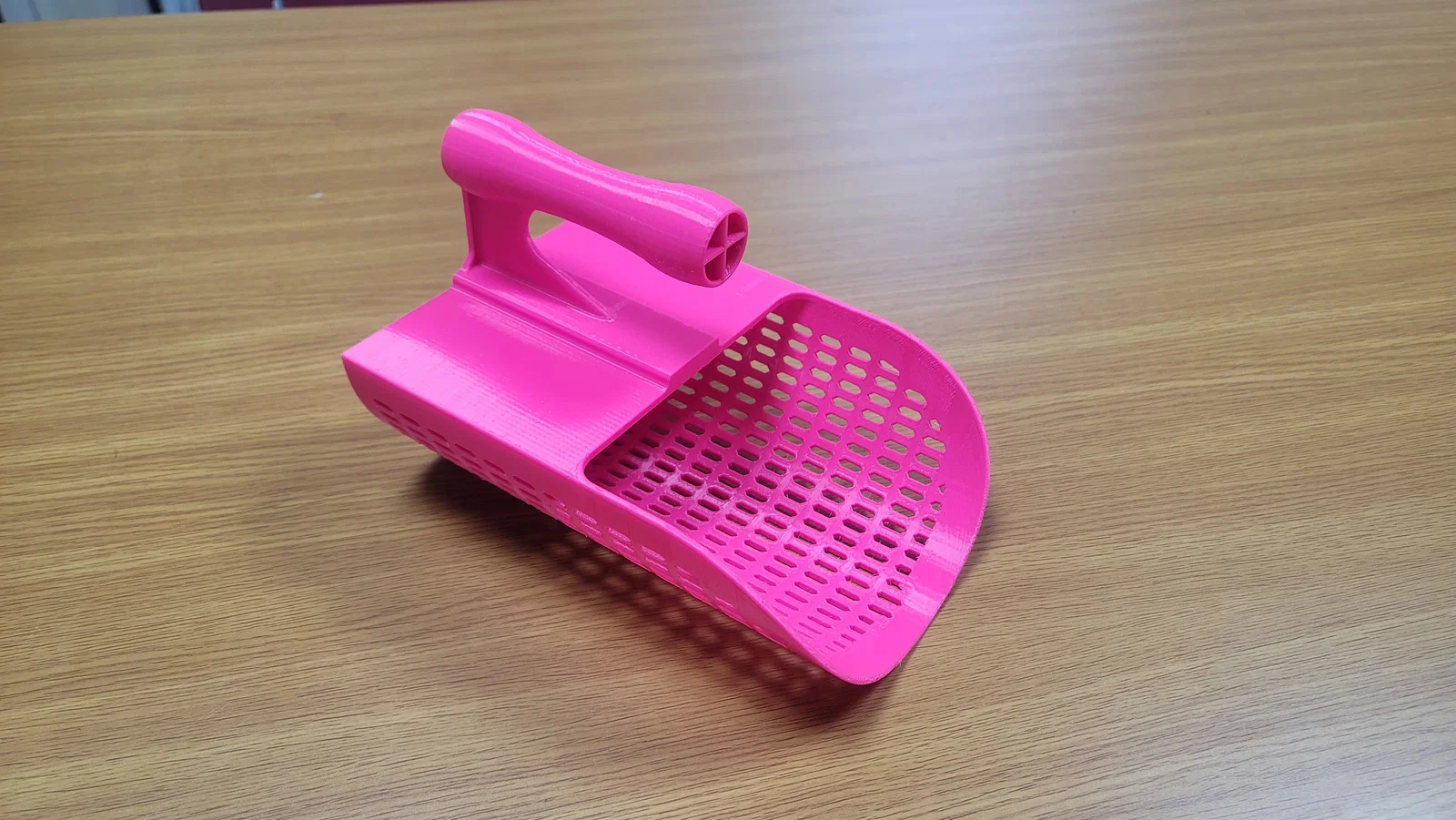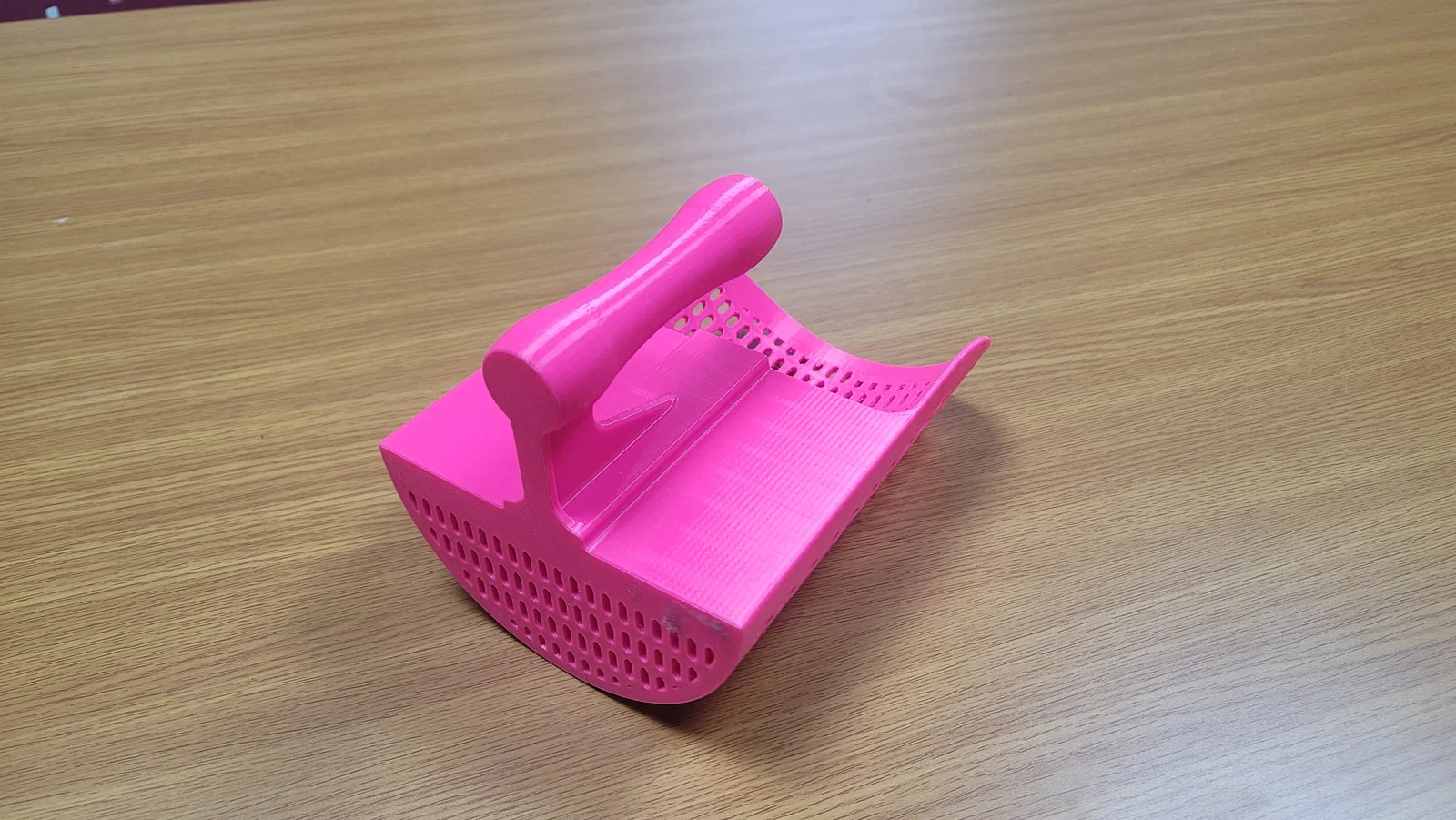 Mẫu sand scoop 130mm (khoảng 5.1 inch) dùng để xúc và sàng cát tìm vật nhỏ. Không cần support, in PETG. Có bản tăng kích thước lỗ (từ 3mm) và bản kéo dài cán 100mm lên 120mm, kèm sửa lỗi mũi xẻng.
