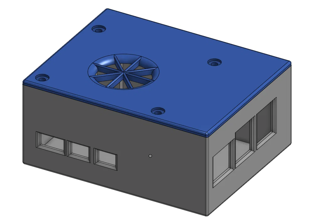 Case tùy biến cho Raspberry Pi 5 dùng Pimoroni NVMe Base và Waveshare PoE Hat, có thêm fan phụ làm mát cho SSD NVMe. Thiết kế gọn, fit khít; lưu ý bắt buộc tháo thẻ SD trước khi lắp/tháo cụm Pi.
