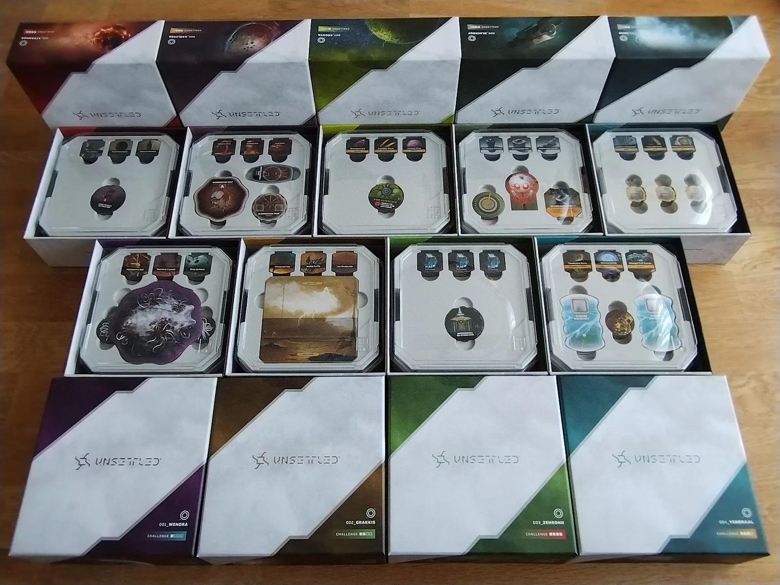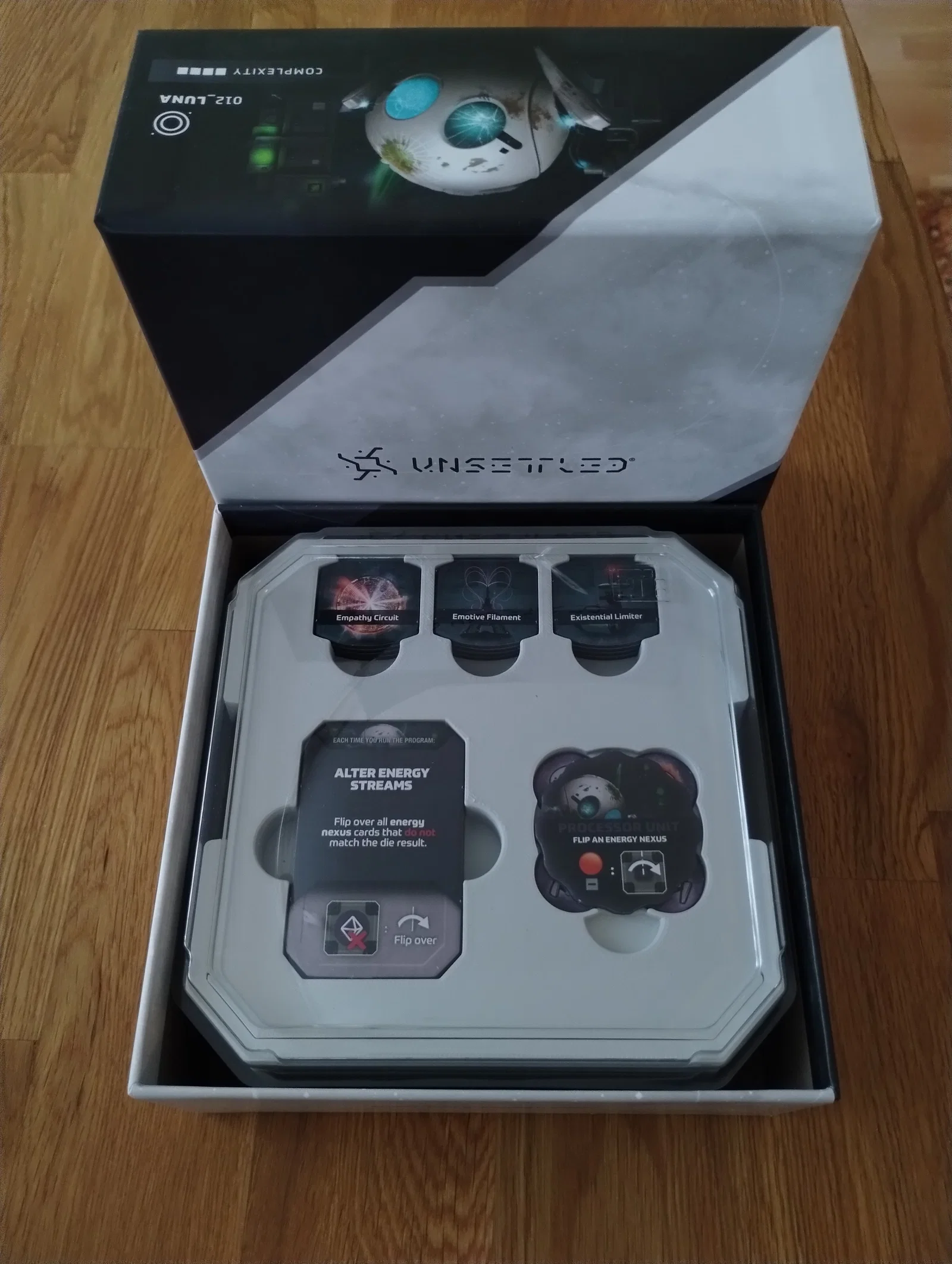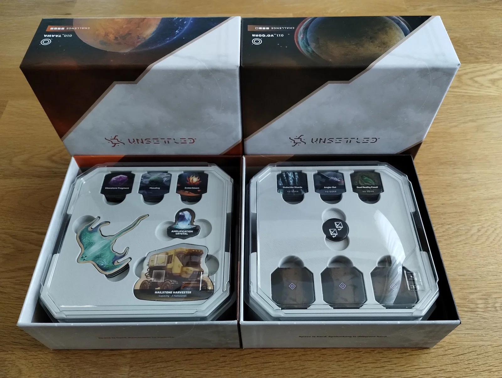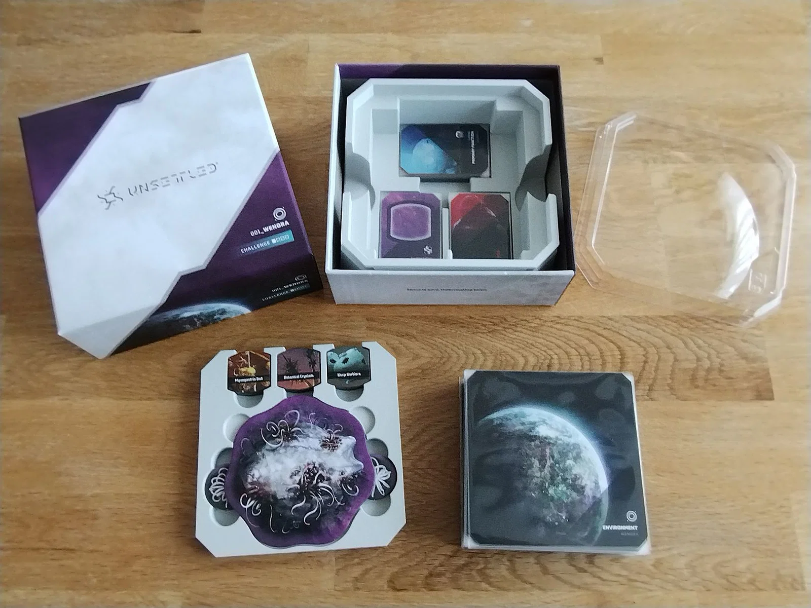Thiết kế này có đủ chỗ cho tất cả các lá bài đã bọc sleeve (kể cả bộ Community Survival Task, dù hơi chật một chút) và có các ngăn chuyên dụng cho token của từng hành tinh. Nắp đậy rất khít, giữ mọi thứ cố định chắc chắn.