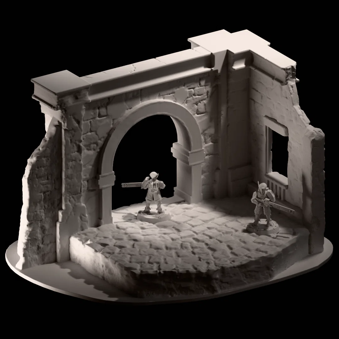 Mẫu 3D printable tàn tích phong cách gothic dành cho miniatures, dùng đế 25mm. Thiết kế bằng Blender, phù hợp làm terrain cho tabletop gaming như wargaming/boardgame.