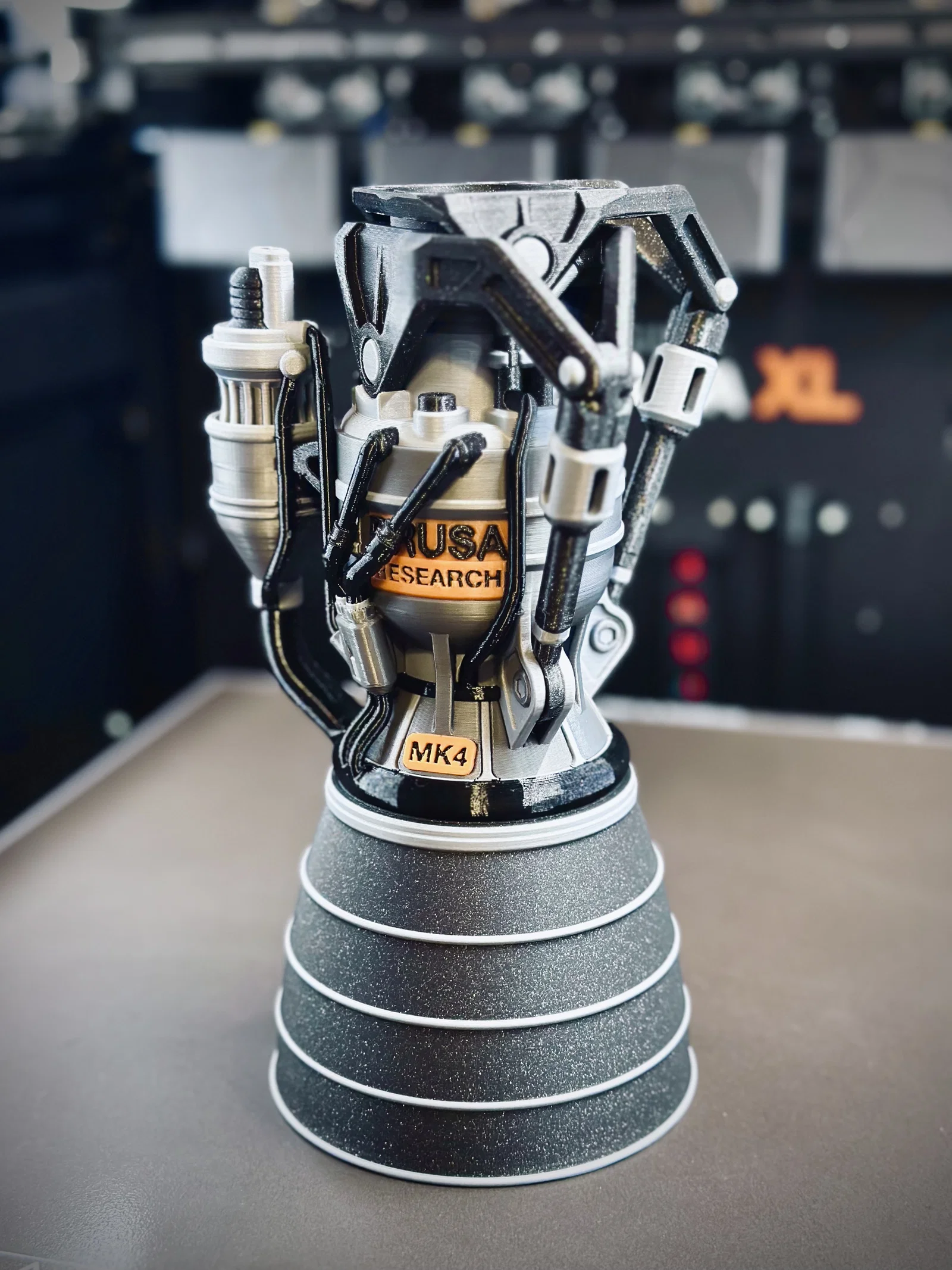 Bản in này là bản remix từ Rocket Engine MK4 của Prusa, nhưng mình cũng muốn ghi công All3DP vì ý tưởng và file .3mf ban đầu mà mình dùng làm điểm xuất phát. Tuy vậy mình đã chỉnh khá nhiều, gồm đổi và sửa màu ở nhiều chỗ, và thêm support để in cho ổn định.