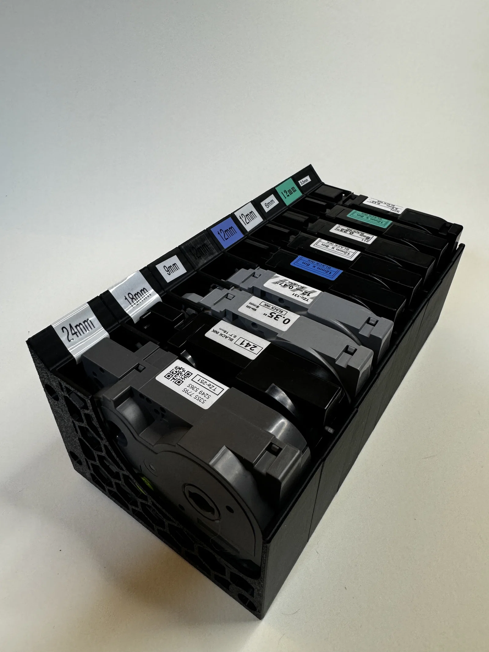 Organizer modular cho băng nhãn Brother P-Touch TZe (3.5–36mm). Tuỳ chọn số ngăn theo từng size, snap-fit lắp ráp chắc chắn, thiết kế honeycomb tiết kiệm filament. Khuyến nghị in PLA+ hoặc PETG và in test Pin/Hole trước.
