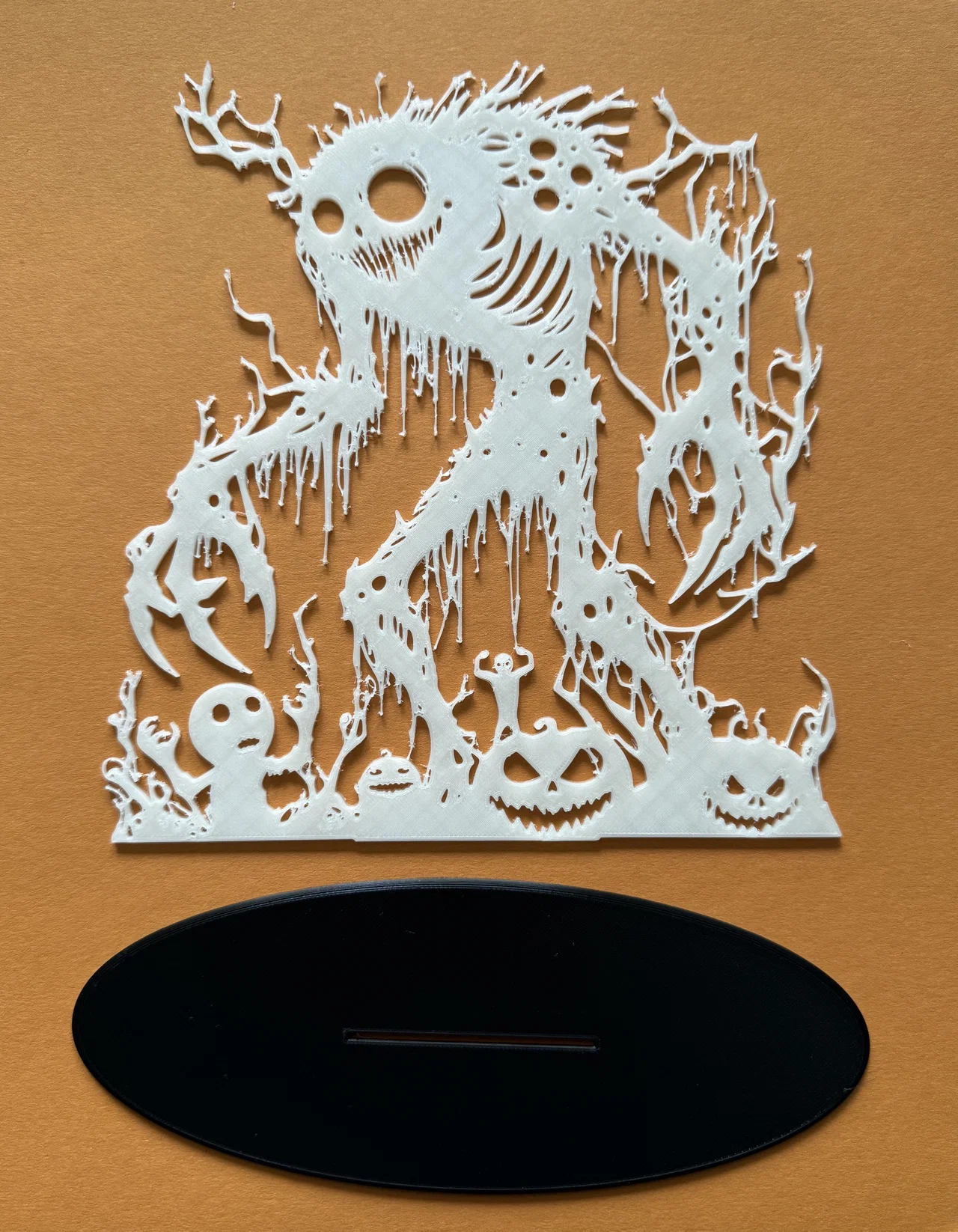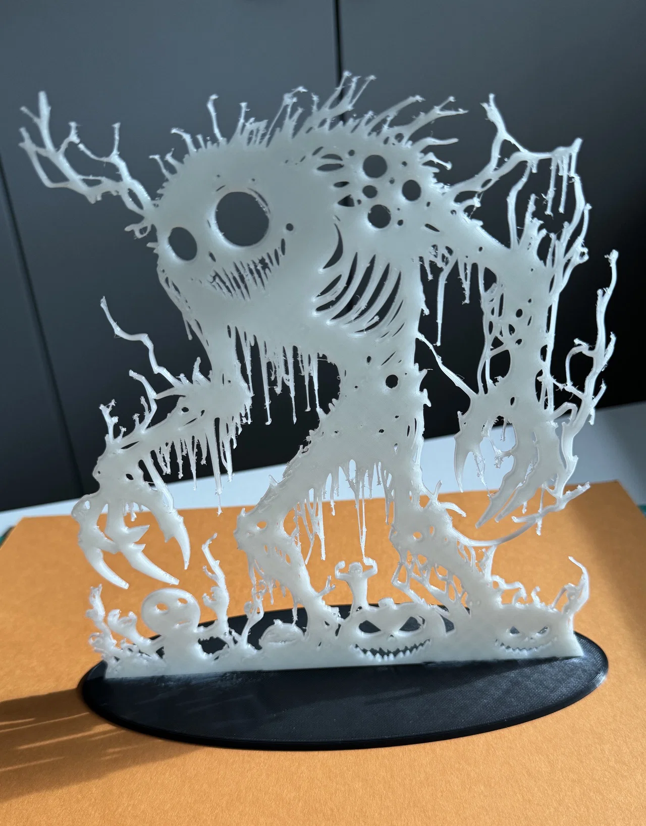 Halloween Monster là mẫu trang trí Halloween có thể để đứng hoặc treo. In bằng filament Glow-in-the-dark PLA thì ban đêm phát sáng rất nổi bật. Thông số tham khảo: nozzle 0,40 mm, layer height 0,2 mm, PrusaSlicer max speed 60 mm/s.