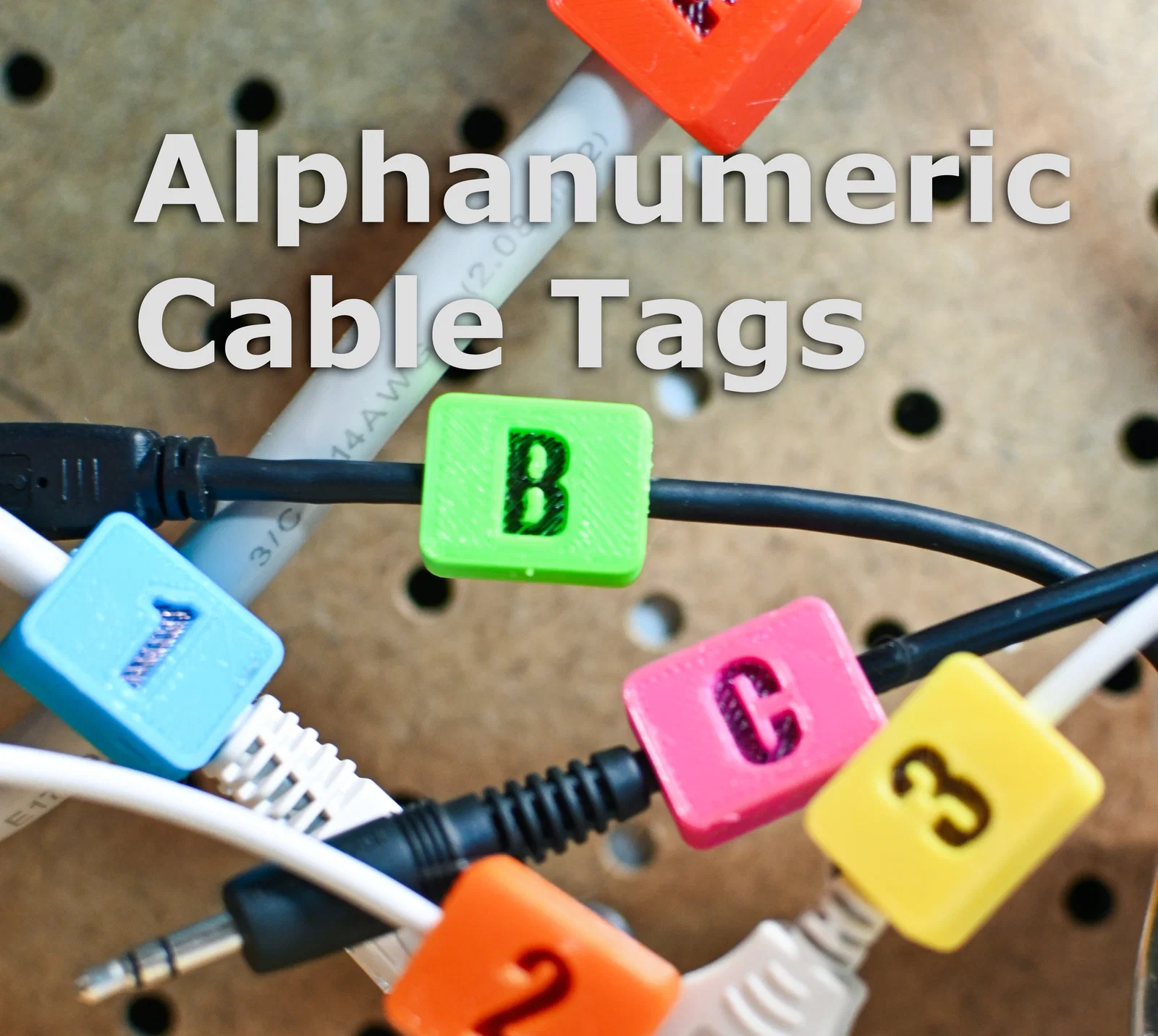 Bộ thẻ tag chữ/số để dán nhãn dây cáp, ôm khít nên khó tuột. Có nhiều size cho Lightning/iPhone, USB, audio, Ethernet và power; có thể chỉnh scale trong slicer để vừa dây. In PLA ổn, không cần support.