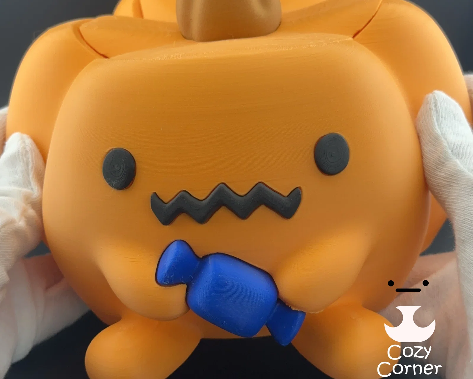 Quả bí ngô dễ thương để đựng kẹo Halloween. Mẫu dễ in, có 2 bản: in liền hoặc in rời để tự lắp. Phần lớn ráp không cần keo, chỗ cần dán nên dùng CA glue/3D Gloop.