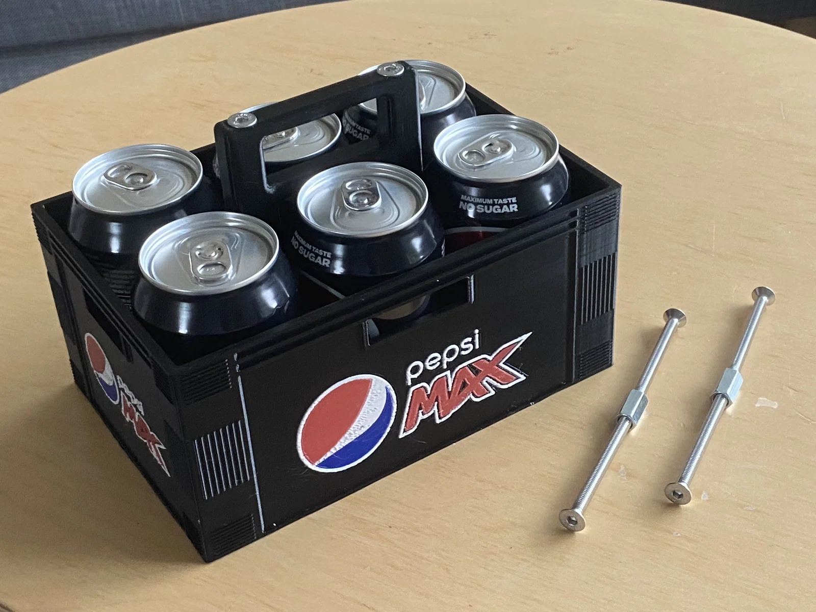 Hộp mini nhỏ gọn để mang theo 6 lon Pepsi Max (hoặc bất kỳ lon kích cỡ tiêu chuẩn). Phiên bản này được chỉnh sửa để dùng vít/đai ốc, giúp nén lớp in và tăng độ cứng chắc; file 3MF sẽ tự pause khi cần lắp vít.
