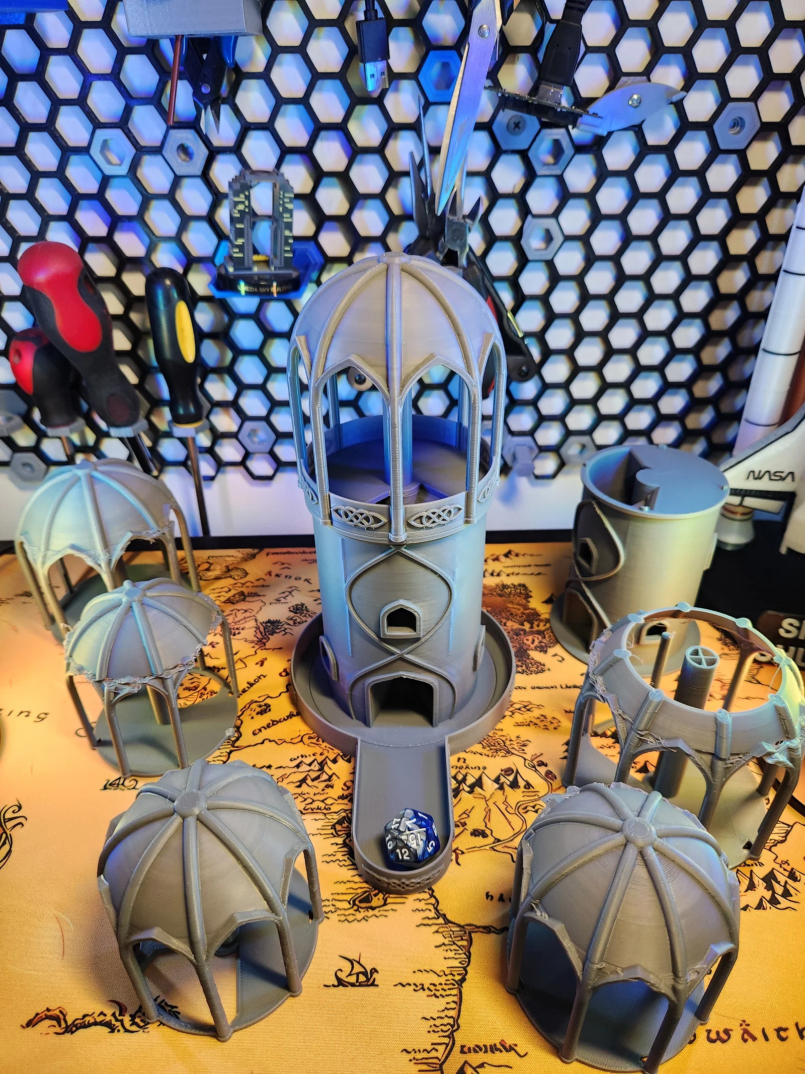 Thêm chút ma thuật kiểu Elf cho buổi chơi game tối nay với tháp thả xúc xắc này. Lấy cảm hứng từ những đường nét thanh thoát của các thành phố Elf. Tháp vừa xúc xắc chuẩn 20mm và cho cú lăn rơi mượt, đã tay mỗi lần thả. Có thể cũng sẽ vừa với xúc xắc lớn hơn.