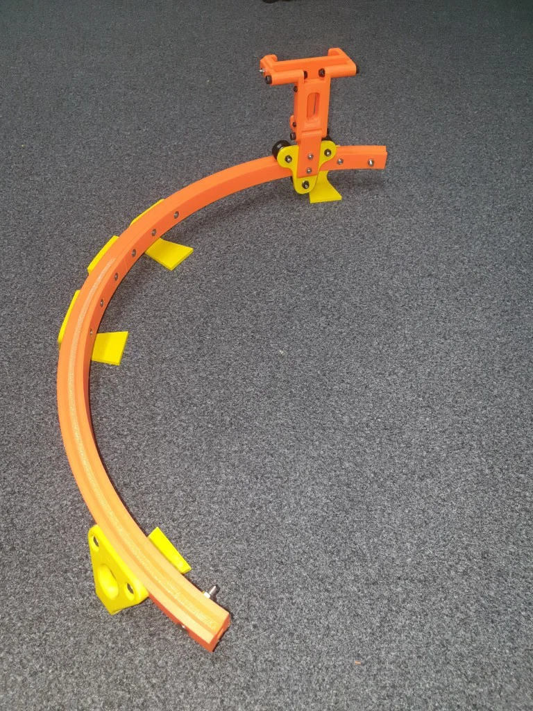 Thanh trượt camera dạng cong vận hành thủ công theo kiểu monorail, tạo chuyển động xoay mượt mà mà không cần điện hay điện tử. Bán kính ~300mm, đoạn cong ~600mm (~60°), kẹp điện thoại; có thể chỉnh để gắn camera khác.
