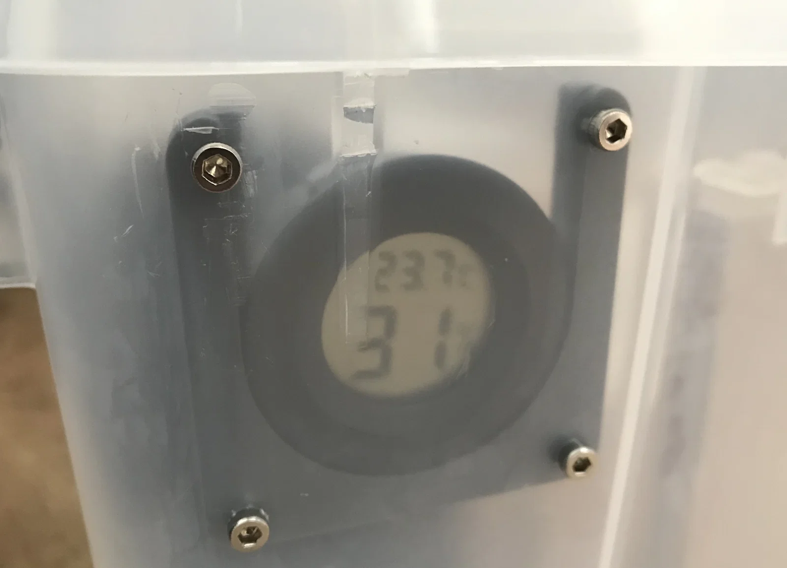 Mình lỡ mua mấy cái đồng hồ đo nhiệt độ, độ ẩm (hygrometer) dạng tròn vì tưởng nó tiện hơn loại vuông. Nhưng mình sai rồi, các bạn nên mua loại vuông thì tốt hơn nhé :) Dù vậy, mấy cái này dùng để đo độ ẩm bên trong hộp đựng sợi nhựa in 3D thì cực kỳ tuyệt vời. Mẫu in đơn giản này sẽ giúp bạn gắn đồng hồ tròn vào hộp với công sức tối thiểu. Bạn chỉ cần vài con ốc m3x8mm và vài con tán M3 là xong. Hình ảnh đính kèm chắc sẽ giải thích rõ hơn cho mọi người. ### Hướng dẫn in Mình in mẫu này mà không cần dùng support, đặt mặt có lỗ tán ốc hướng xuống dưới. Tuy nhìn không được đẹp mắt lắm nhưng chất lượng thì hoàn toàn ổn.