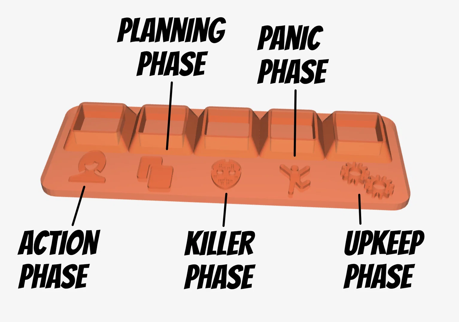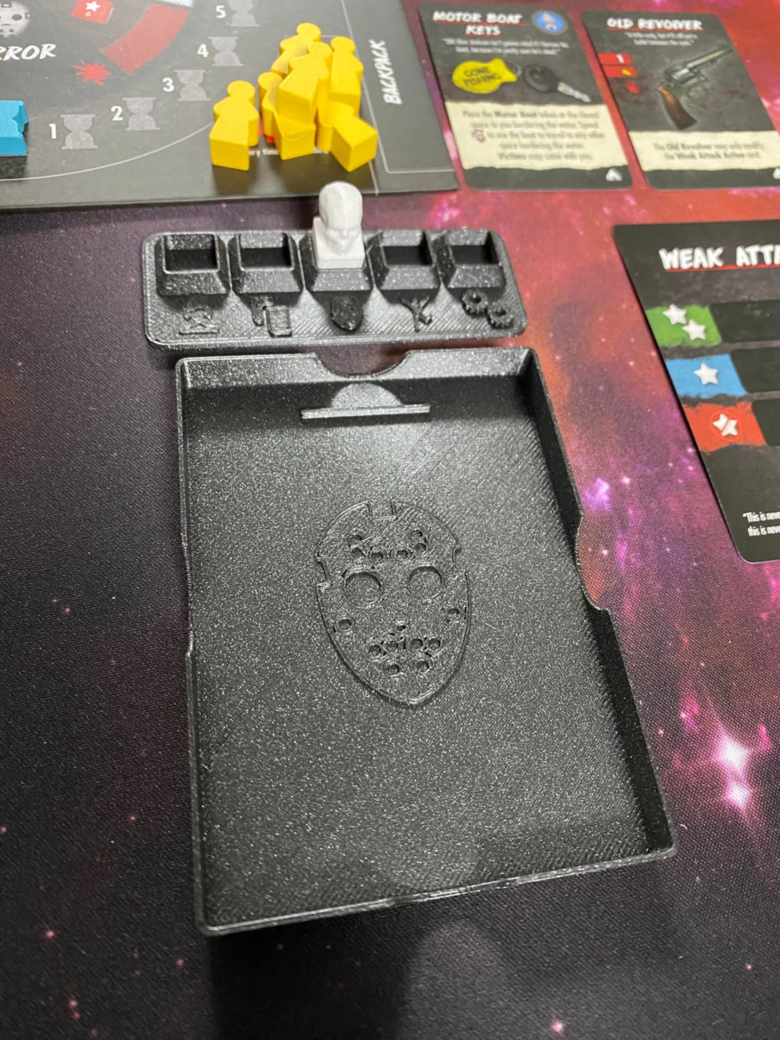 Bộ phụ kiện cho board game Final Girl gồm khay đựng các action card đã chơi và game phase tracker kèm pin đánh dấu phase hiện tại. Thiết kế gọn, tất cả đều để vừa trong core book.