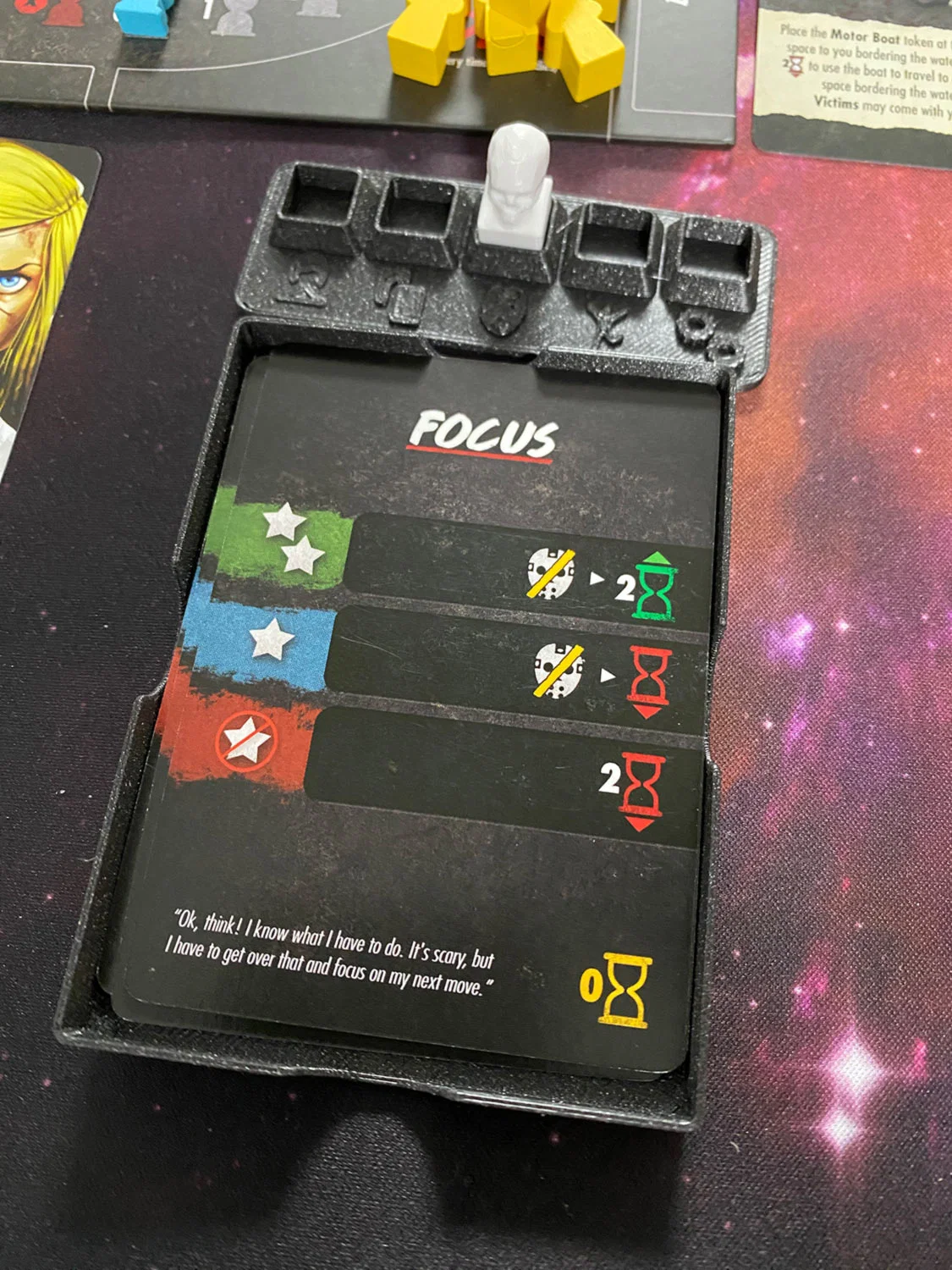 Vì đôi khi mình bị rối ở các phase của game và mấy lá action card, nên mình làm một cái hộp nhỏ để bỏ các action card đã dùng. Mình cũng làm thêm một cái phase tracker kèm một cây pin để đánh dấu hiện tại đang ở phase nào. Tất cả đều vừa trong core book luôn.