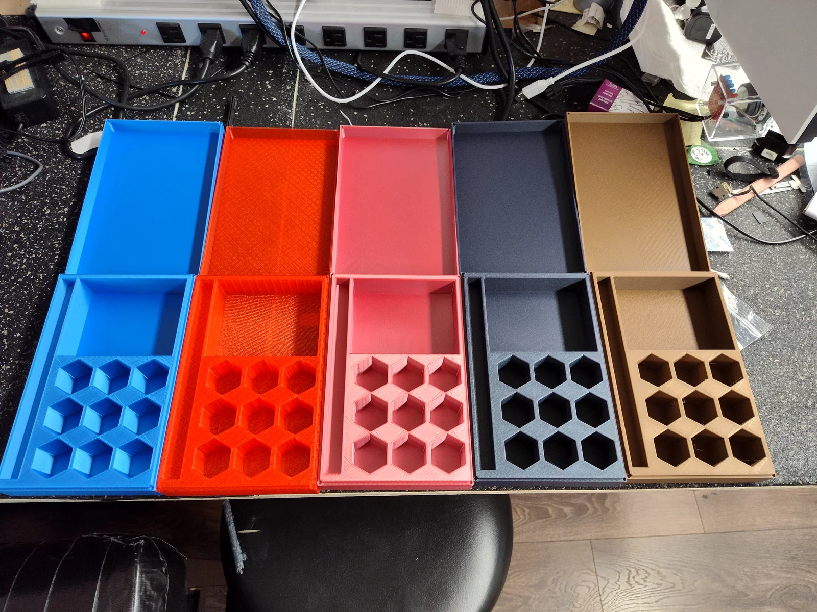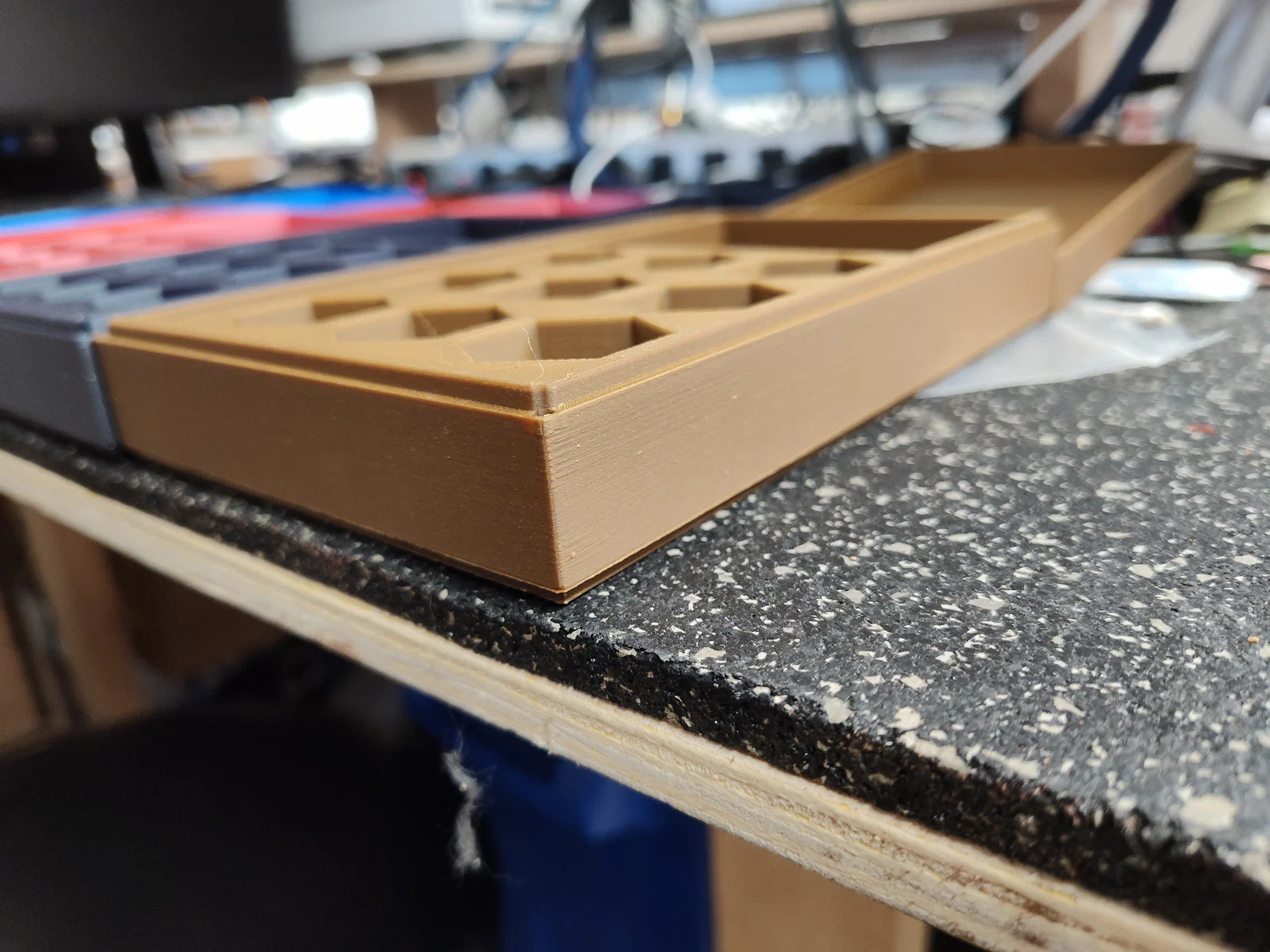 DND Case là hộp đựng cho Dungeons and Dragons, có chỗ để bút, ngăn cất mini figure (100x75x28mm), khay dice tối đa 9 viên và vị trí gắn 4 nam châm recessed 2x2mm. Kích thước tổng 126x200x29.36mm.