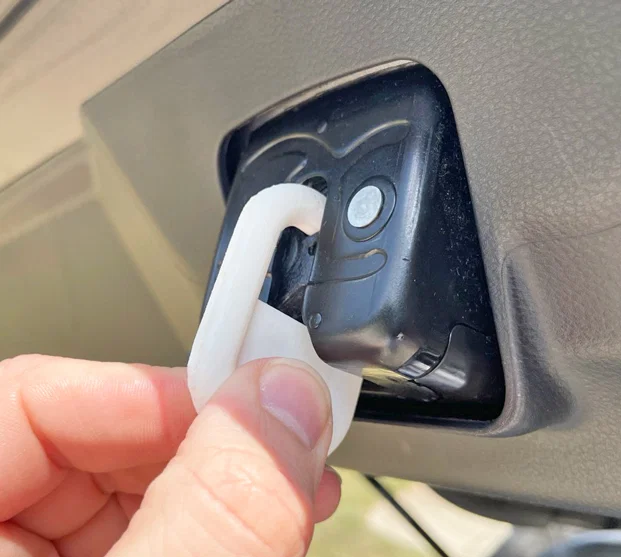 Khi đi car camping từ một chiếc hatchback, nếu để cửa hatch mở qua đêm thì đôi khi bình ắc quy sẽ bị tụt vì xe vẫn “nghĩ” là cửa đang mở. Đây là một cái vòng có thể nhét vào cơ cấu latch để đánh lừa xe rằng cửa hatch đã đóng, nhờ đó giúp tiết kiệm pin/ắc quy.