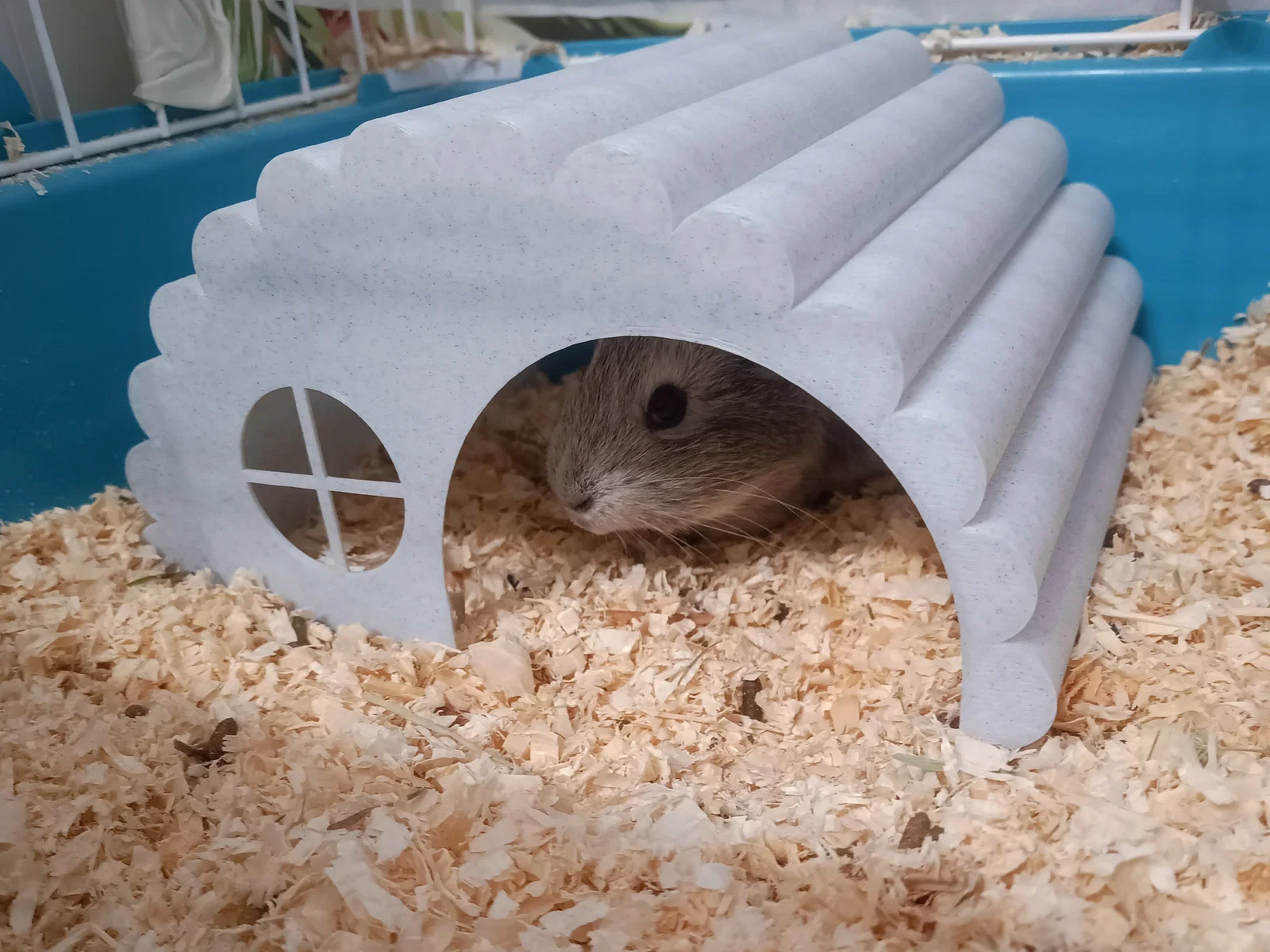 Mẫu nhà gỗ trú ẩn ấm cúng cho hamster hoặc guinea pig. Có chân nhỏ để chôn xuống lớp lót chuồng giúp ổn định. Thiết kế vừa 2 guinea pig, có thể scale nhỏ (gợi ý 55%) cho hamster.