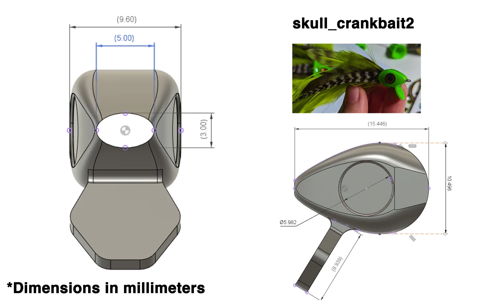 Bộ thiết kế Fish Skulls mình tự 3D model và in 3D để buộc bait fish flies. Có kèm hình kích thước/độ mở chỗ hook eye đi ra để bạn chọn hook phù hợp, cùng các link video mình làm và test trên YouTube.