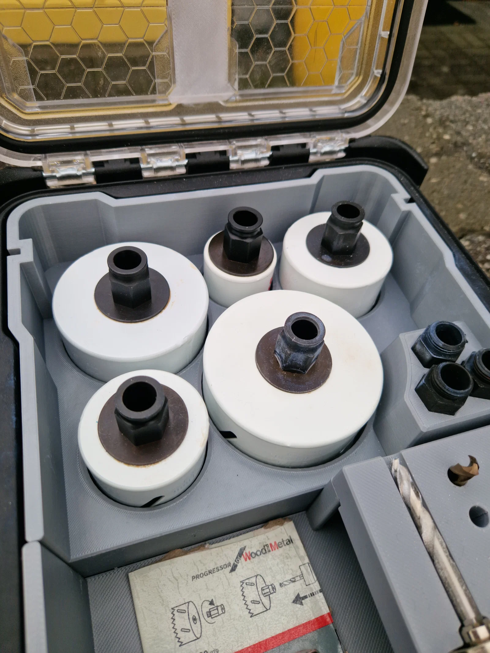 Mình làm cái insert này cho hộp Milwaukee Packout Compact organizer, vừa khít với bộ Bosch Power Change hole saw của mình, gồm các cốc hole saw size 40, 51, 60, 73 và 83 mm.