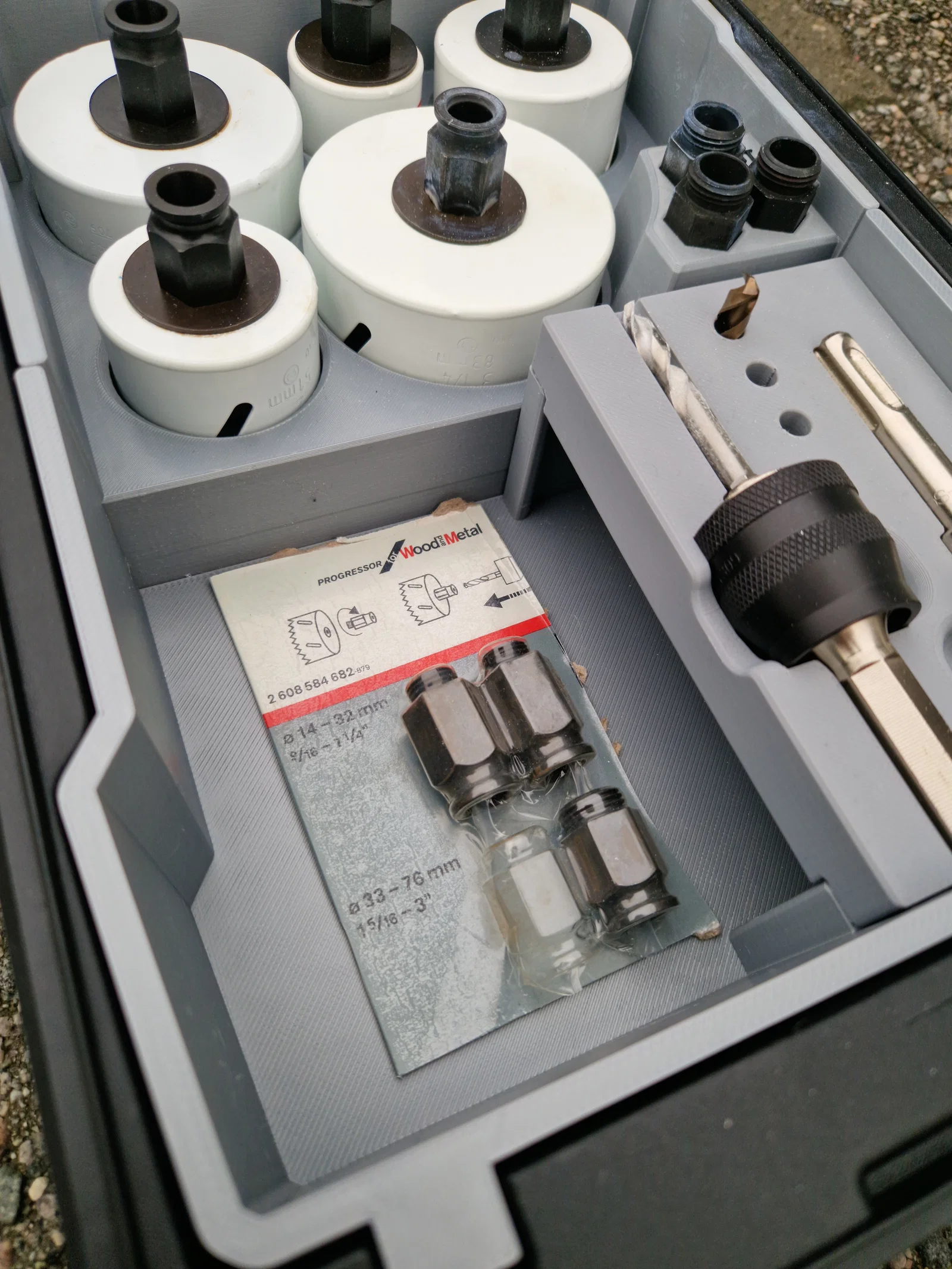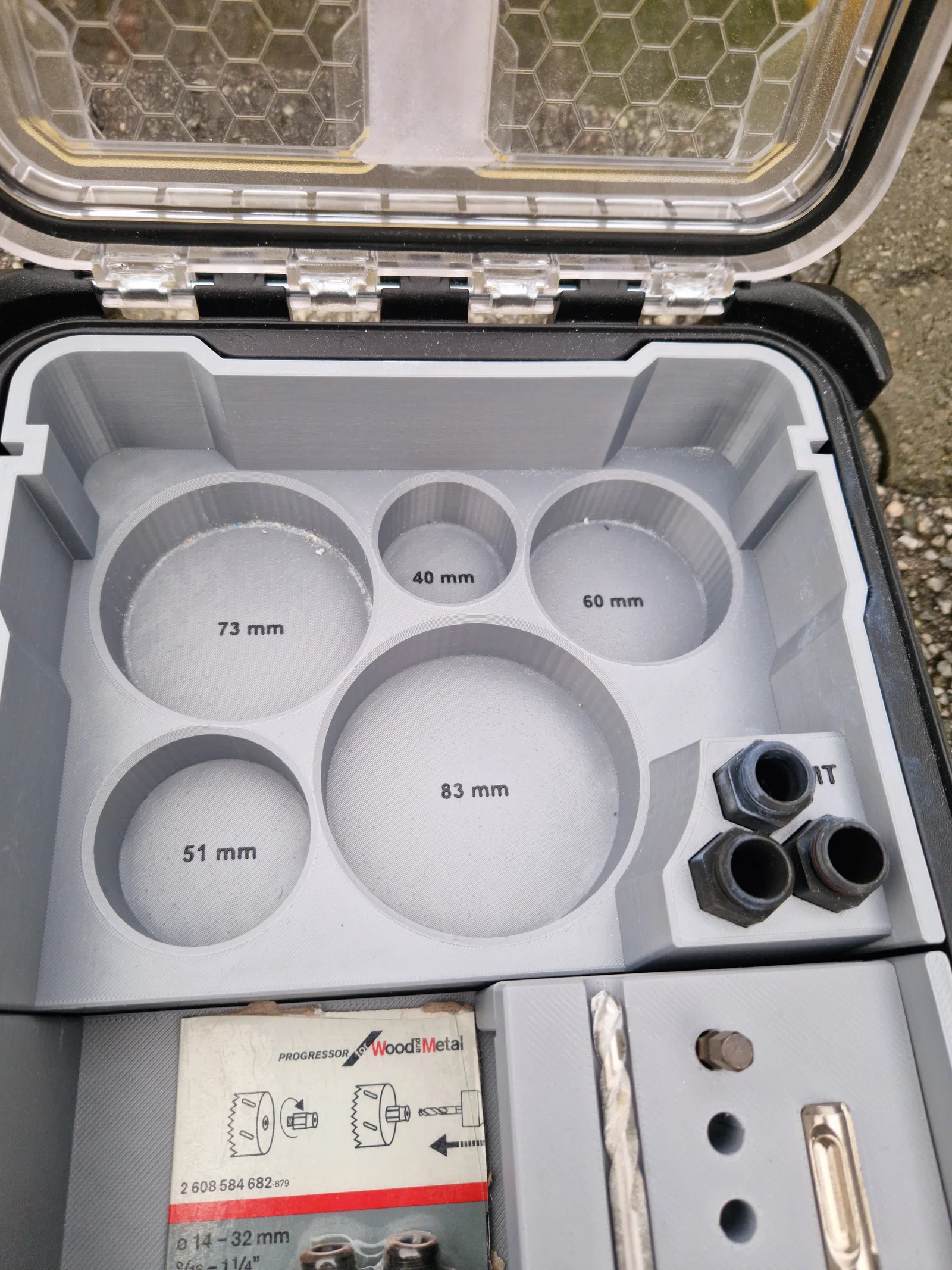 Insert cho Milwaukee Packout Compact organizer, vừa các cốc Bosch Power Change hole saw 40/51/60/73/83 mm. Có chỗ để center drill dự phòng và ngàm giữ arbor 11 mm & SDS+. Kèm link mẫu xóa rãnh nắp do bị vướng.