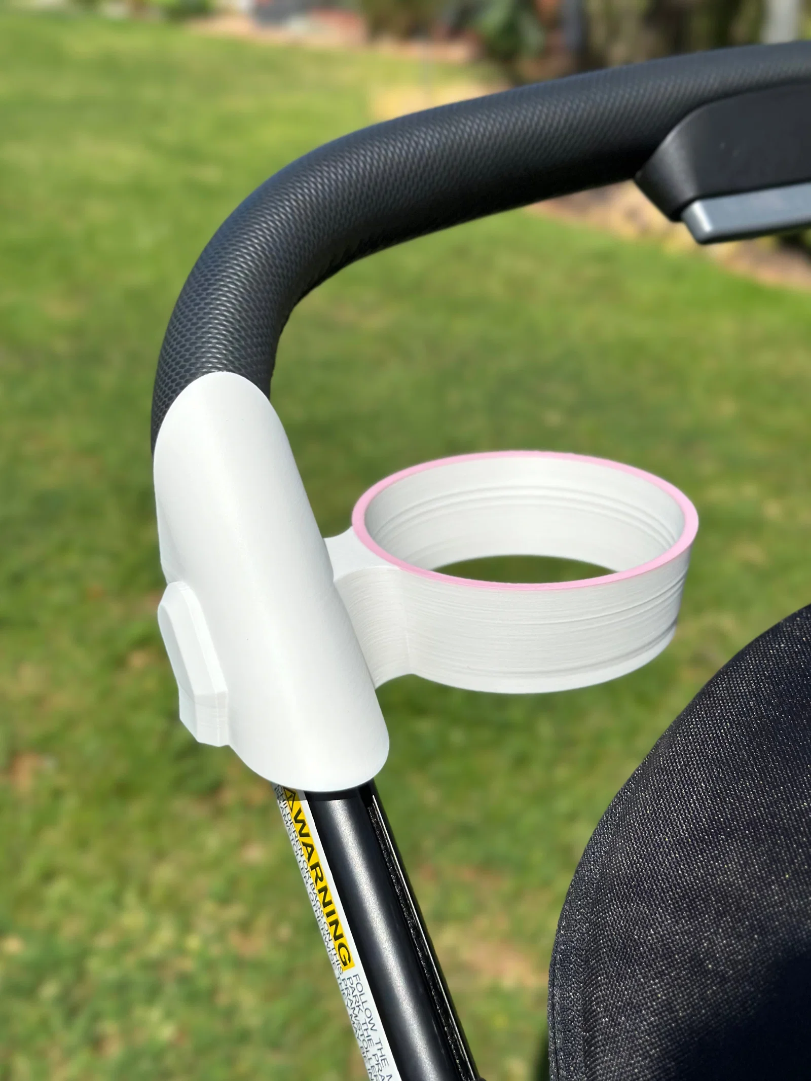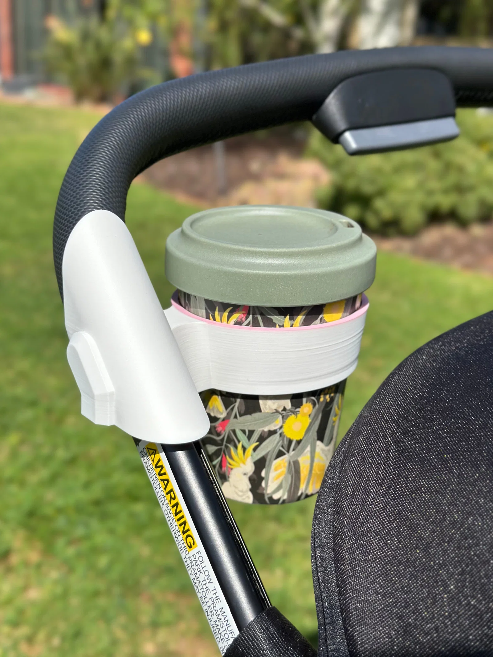 Giá để ly in nguyên khối cho xe đẩy Joolz Aer+, trượt vào rãnh bên phải và tì lên thanh ngang nên chắc chắn, không cần ốc vít hay lắp ráp. Kích thước trong: 80mm miệng, thuôn 72.6mm đáy; không chỉnh được.