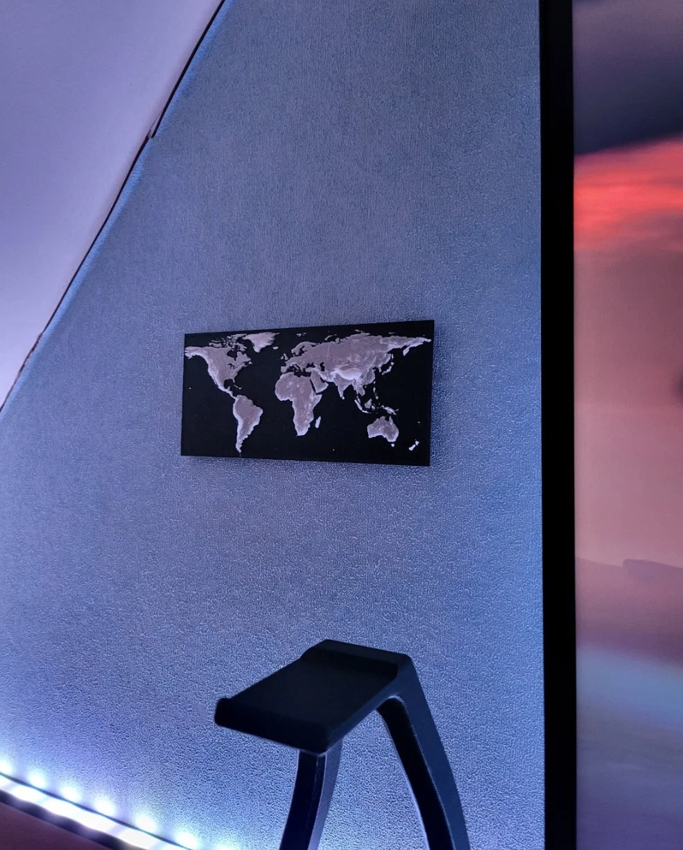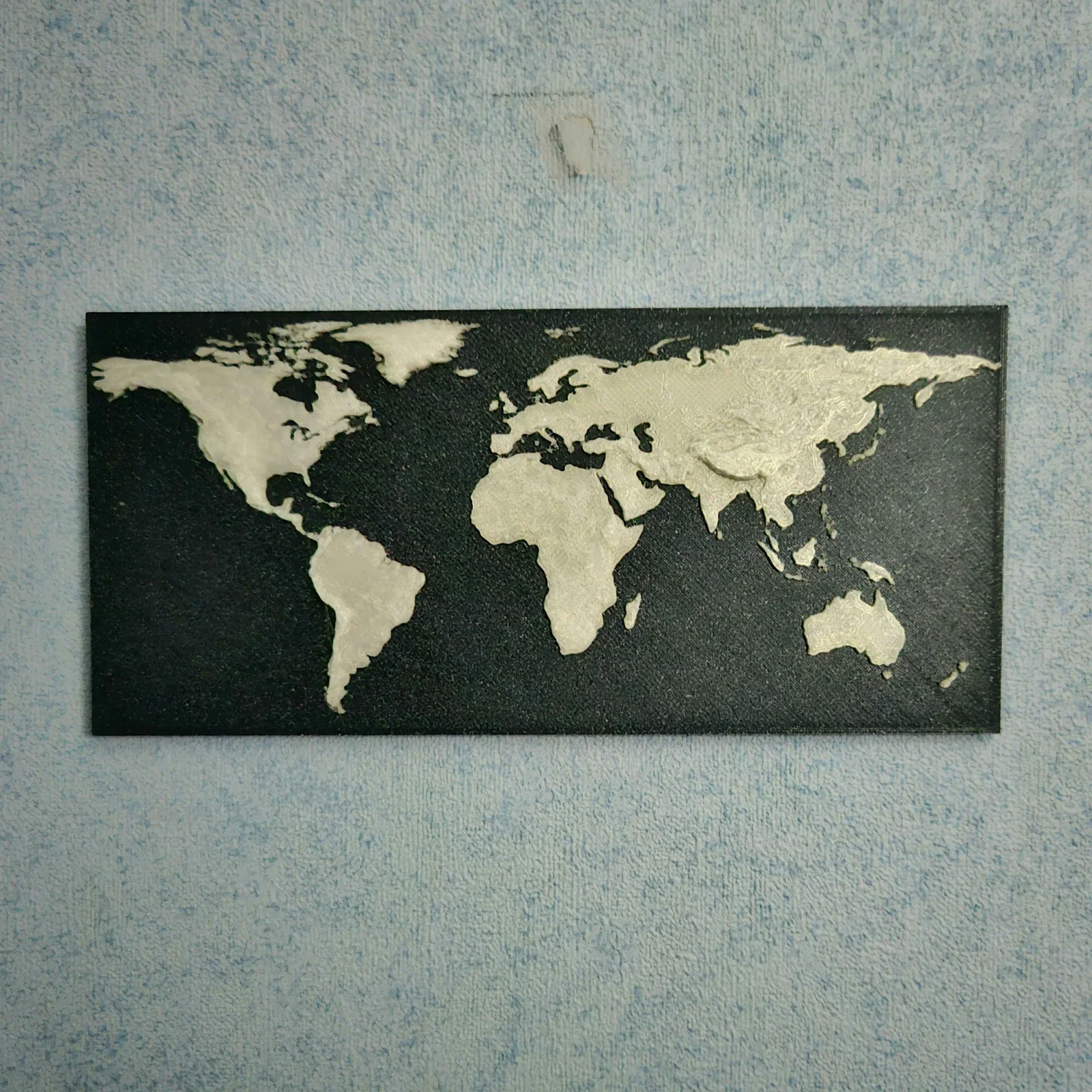 Plaque bản đồ thế giới theo phép chiếu Mercator với địa hình (topology) phóng đại để trưng bày. Có thể scale trong slicer; khuyến nghị in 2 màu (đổi màu ở Z=1,7mm) và dùng 100% infill để cứng chắc.