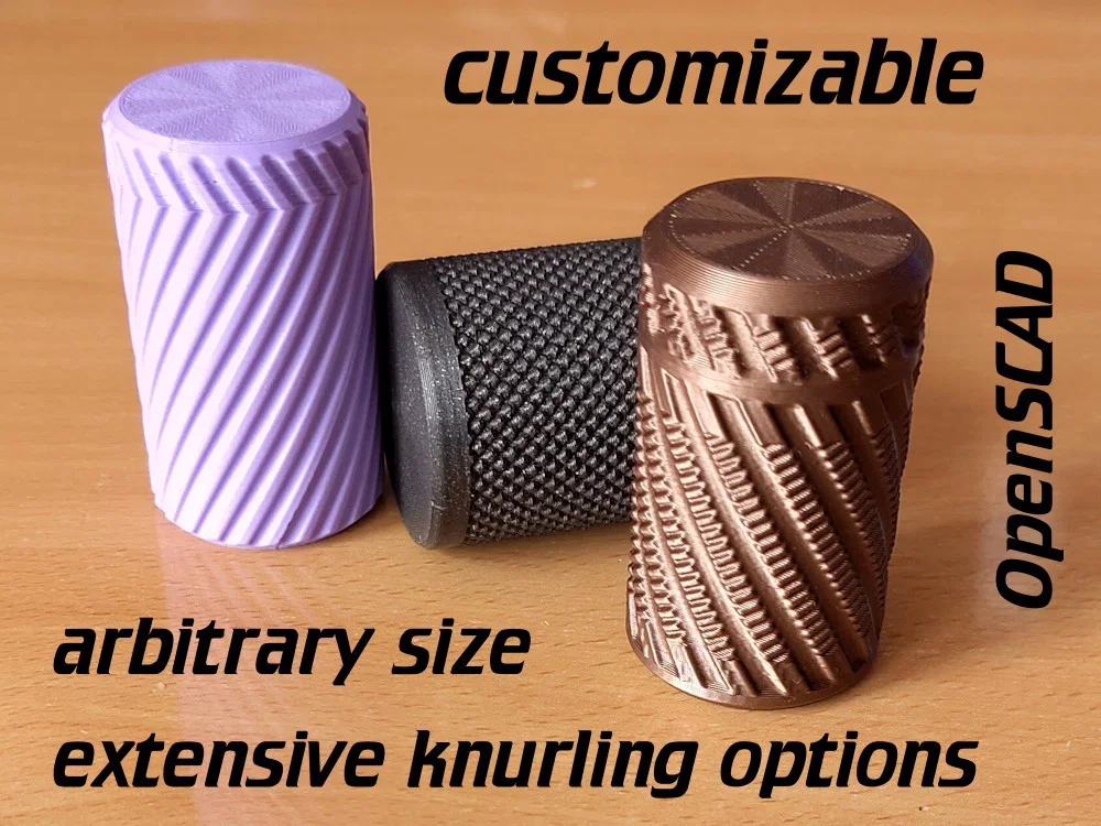 Hộp đựng ốc vít dạng trụ tham số (parametric) với nhiều tuỳ chọn knurling để cầm chắc tay và nhìn đẹp. Tuỳ biến trực tiếp trong OpenSCAD rồi render/export STL để đem đi in.