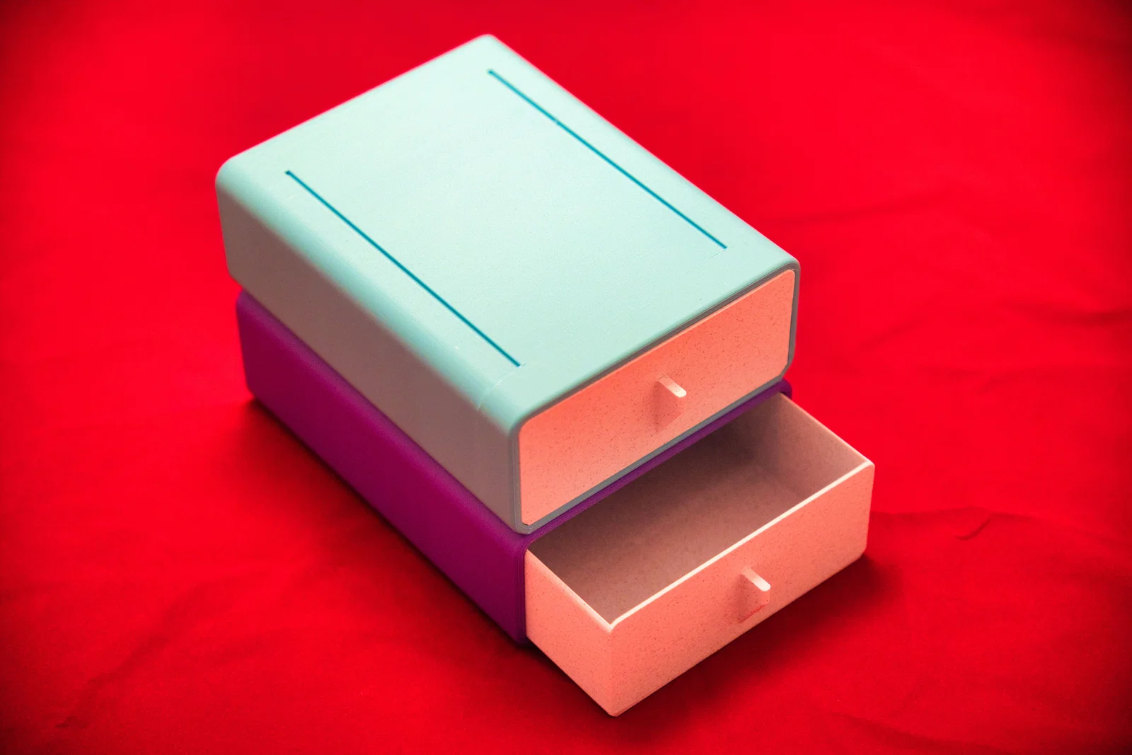 Hộp lưu trữ văn phòng xếp chồng có ngăn kéo, hợp để đặt trong tủ locker ở trường hoặc trên bàn làm việc để sắp xếp đồ gọn gàng. Model đã orient tối ưu, không cần support, dễ in và lắp ráp.